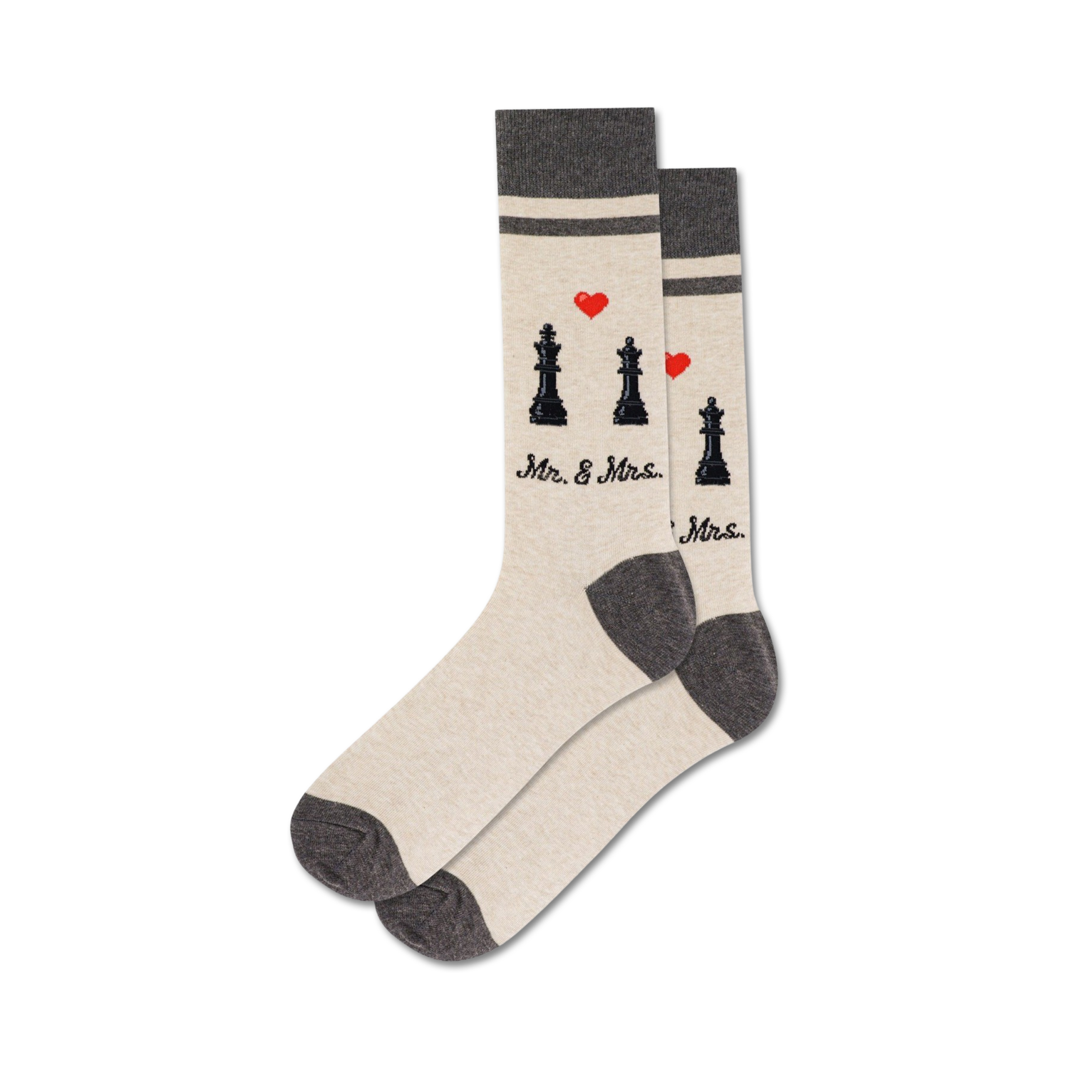 Who needs a boring old-fashioned pair of socks? Opt for these Mr. and Mrs. wedding-themed socks instead! They're light gray with black and red accents. A pattern of black chess pieces, hearts, and red stripes adds a touch of fun and whimsy, while the words "Mr." and "Mrs." let everyone know that you're a newly married couple. Put on a pair of these crew-length socks and show off your marital status in style!