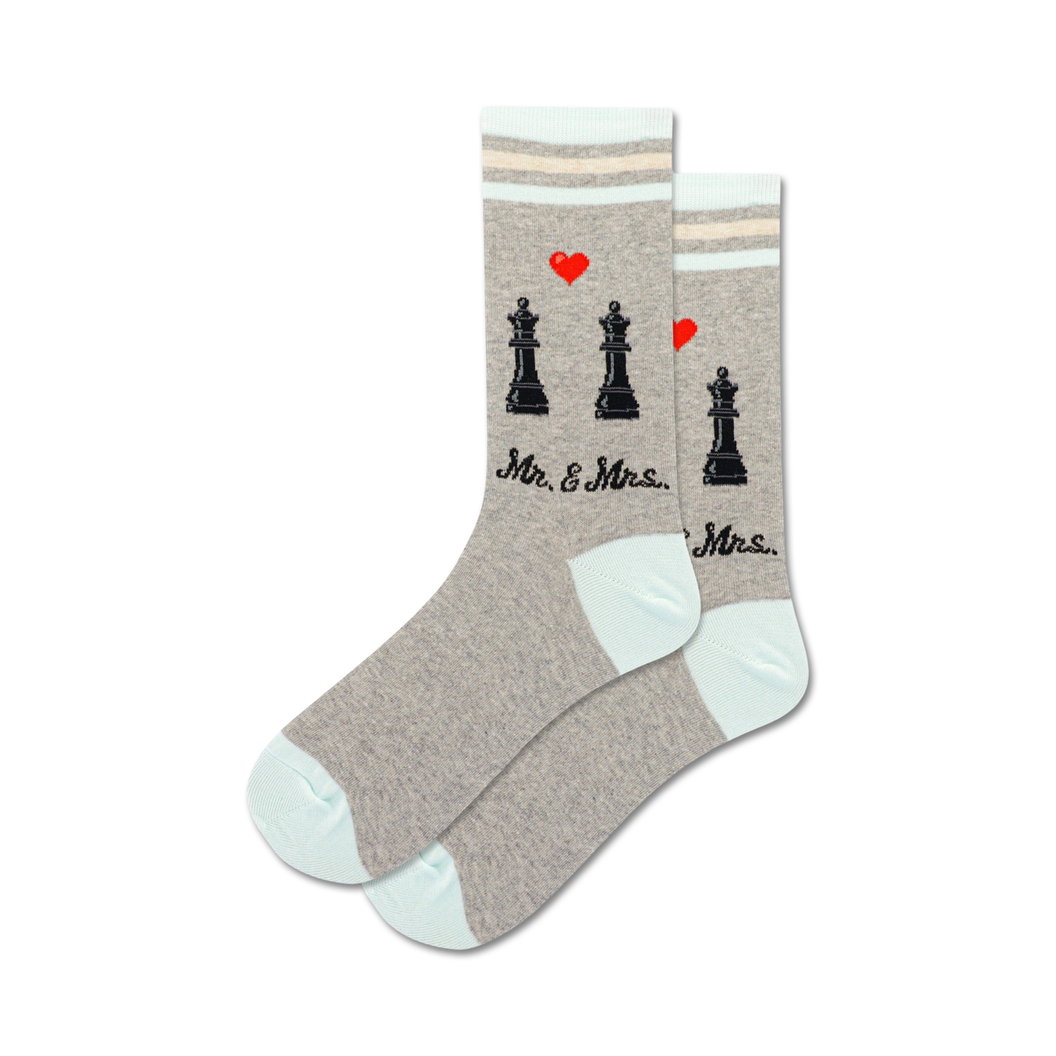 Sure, here is a fun and lighthearted description for novelty socks: "Mr. & Mrs. Checkmate: A Royal Pairing in Socks These gray crew socks are perfect for the newly crowned couple. With a king and queen chess piece pattern, these socks feature a red heart above each royal head. Whether you're walking down the aisle or just adding some fun to your everyday style, these socks are sure to make you feel like a winner. They're also a great gift for any chess enthusiast or newlywed couple. Fun Fact: Did you know that the queen is the most powerful piece in chess? She can move in any direction, as many spaces as she wants. The king, on the other hand, can only move one square in any direction. But don't worry, Mr. King, you still get a heart above your head on these socks!"