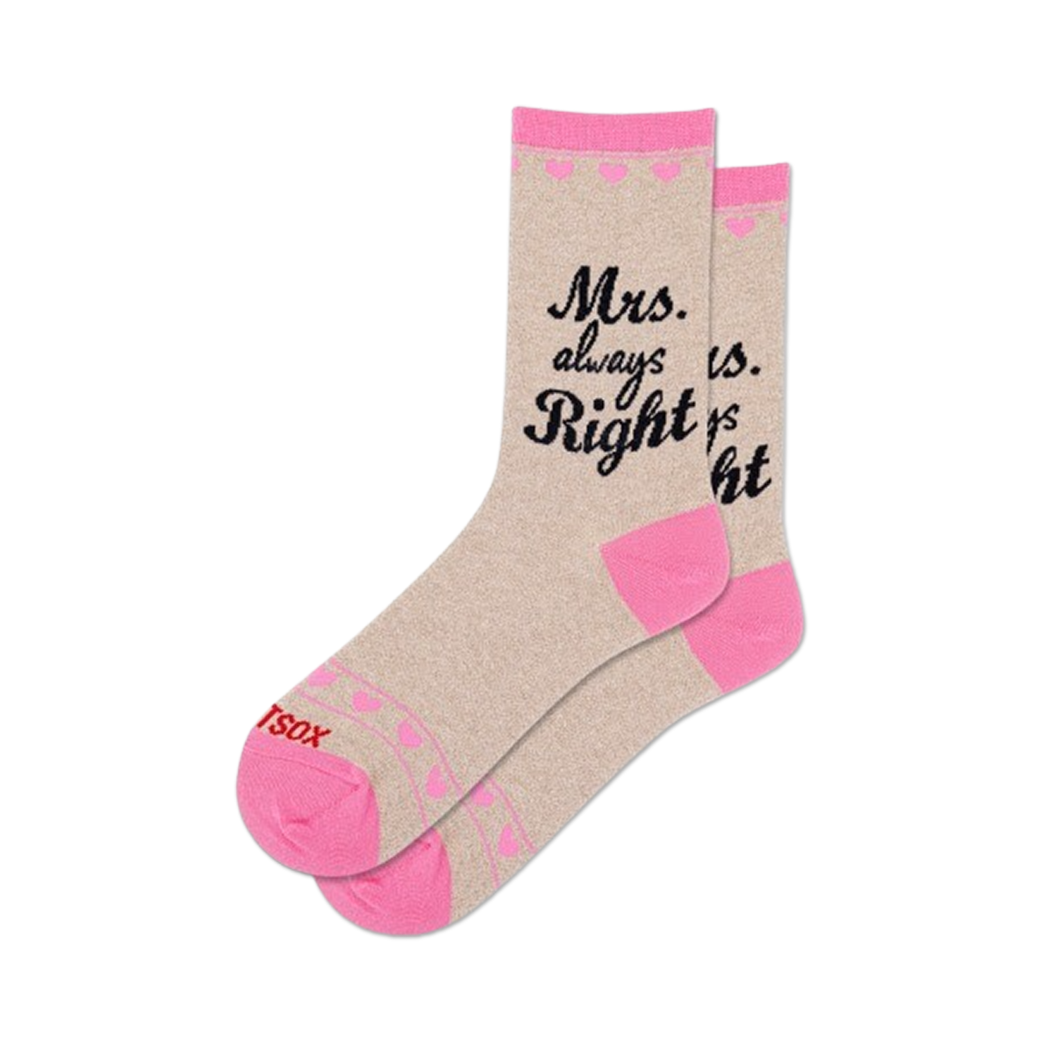 These Mrs. Always Right Metallic socks are the perfect way to show your mom you appreciate her. The pink and beige socks have 'Mrs. Always Right' printed in silver metallic thread. They're made from a soft, durable fabric that's sure to keep her feet comfortable all day long. Fun fact: Studies show the majority of husbands agree that their wives are indeed always right!