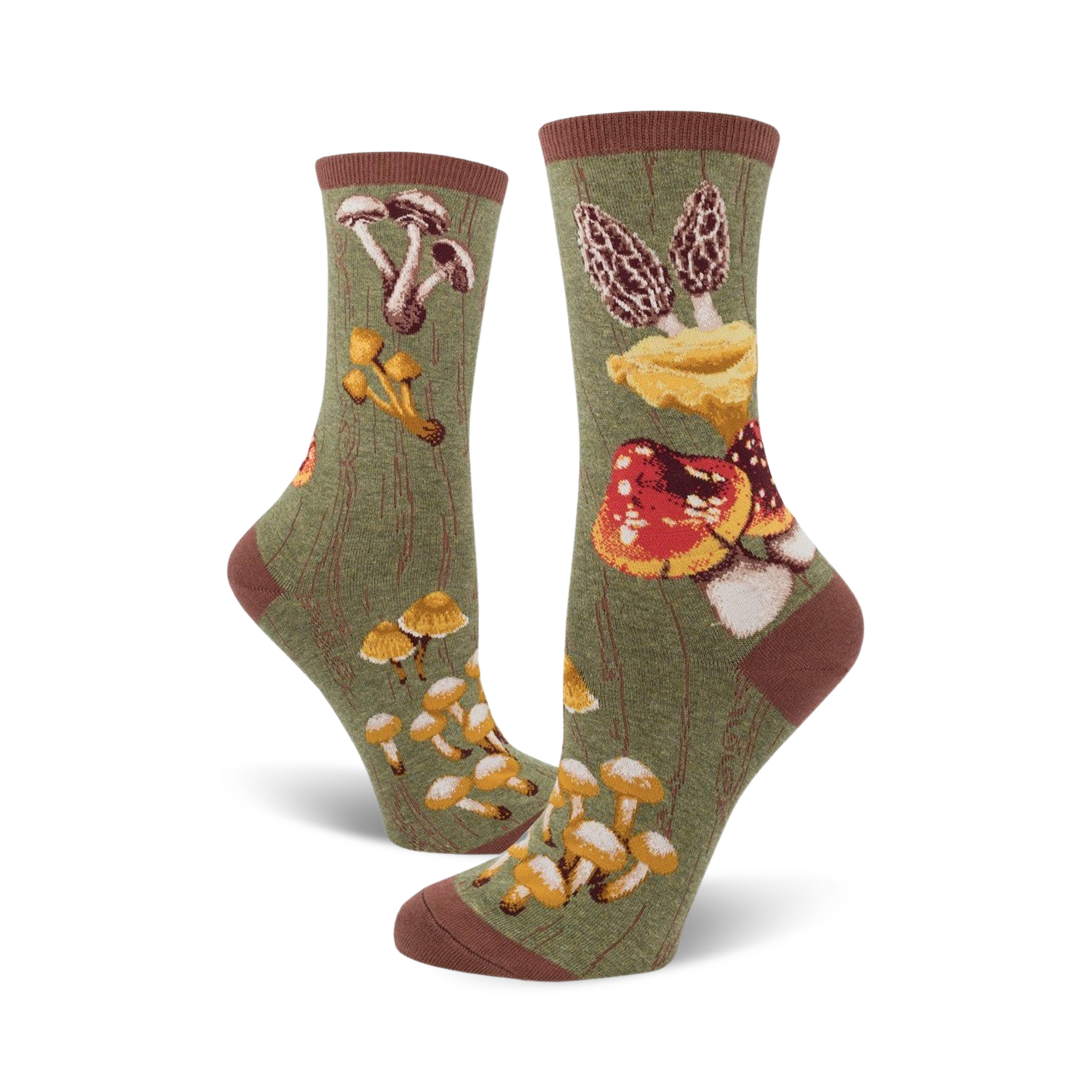 Mush-Room to Grow: Show off your inner fungi with these crew socks flaunting vibrant mushroom motifs on a backdrop of earthy brown. Nature's beauties in shades of red, orange, yellow, purple, and white dance across the fabric, while a tan tree trunk adds a touch of the forest floor. Step into a world of whimsical enchantment with every wear.