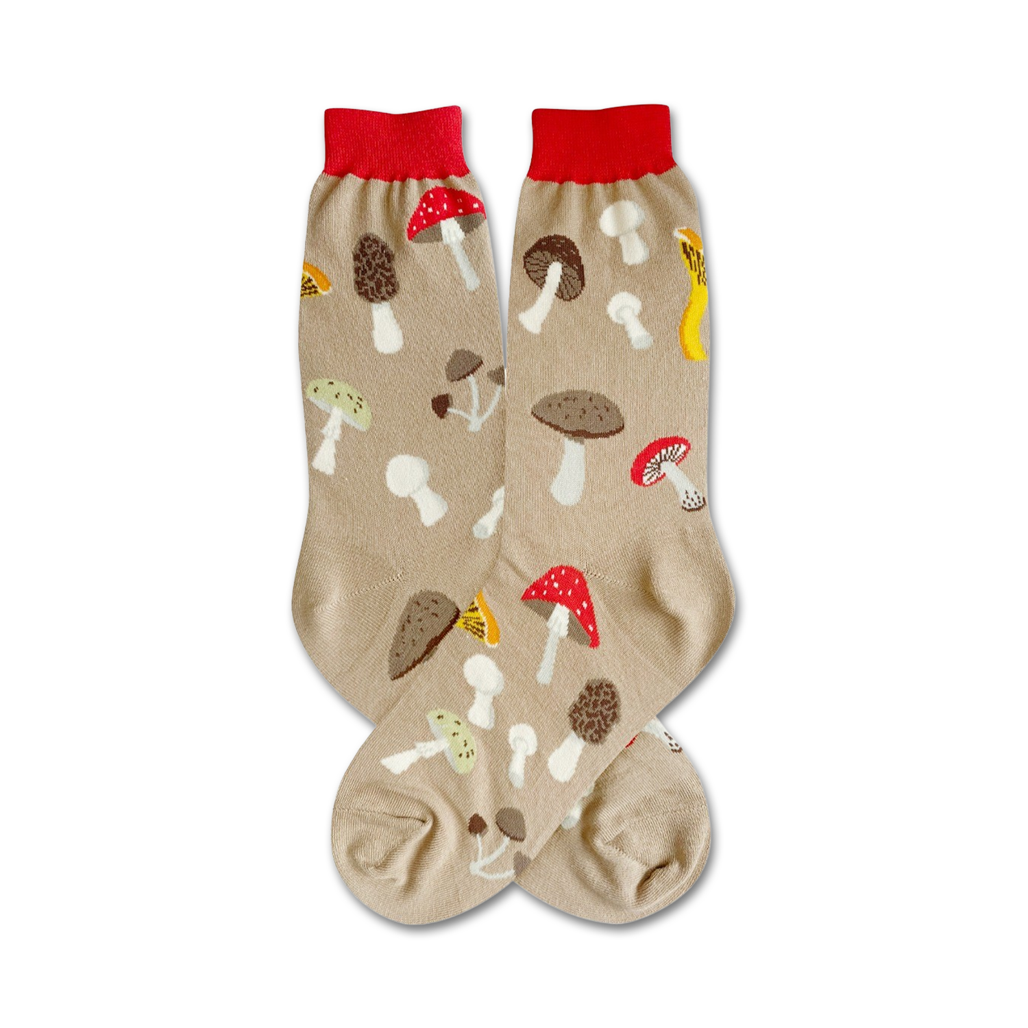 Step into a world of whimsy and wonder with our Mushroom Fungi Crew Socks designed for women! With their light tan base and vibrant all-over mushroom pattern in shades of brown, red, yellow, and white, these socks will have you feeling earthy and fabulous. Whether you're a nature lover or just love quirky fashion, don't miss out on these fun and fashionable footwear.