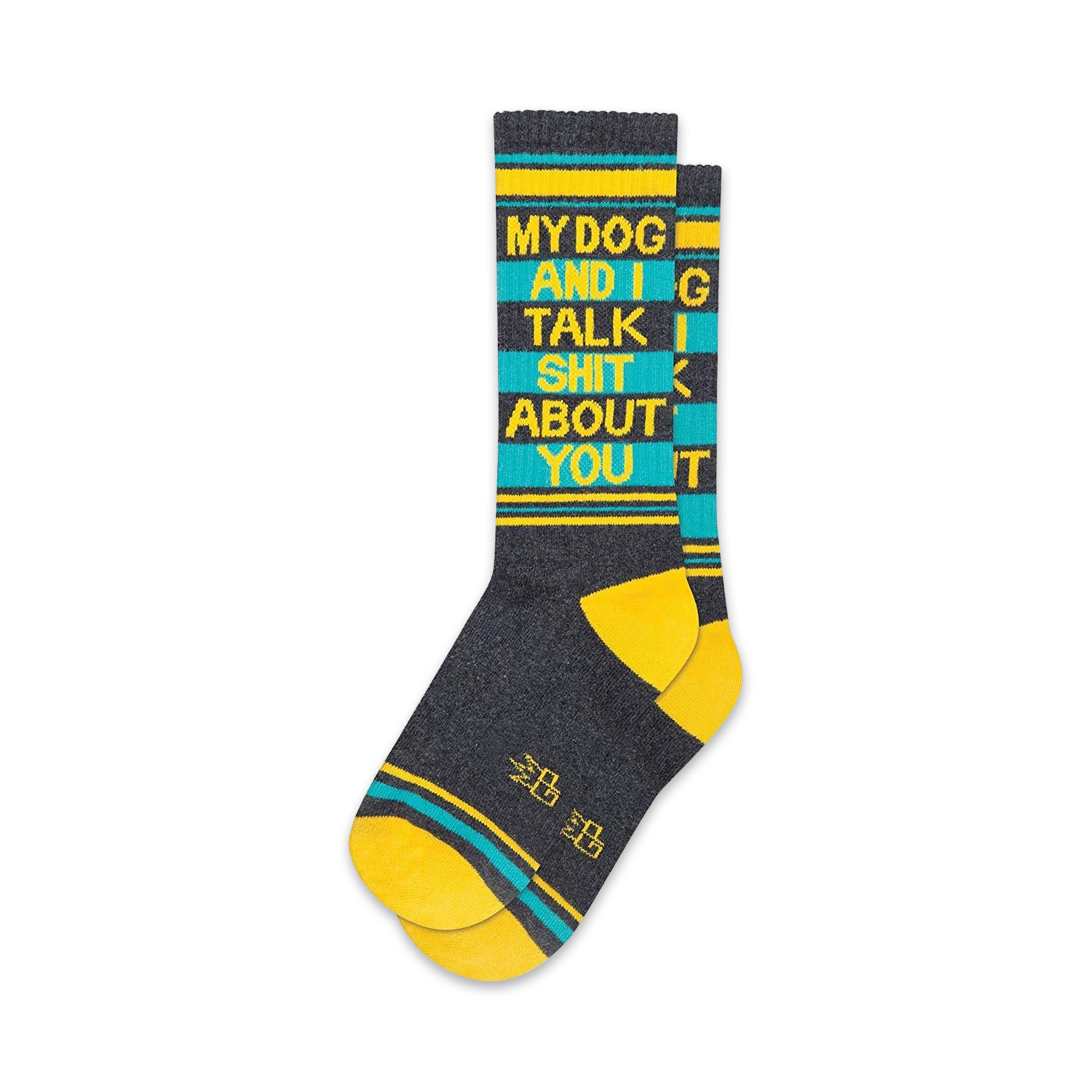 If you consider your dog your best friend and closest confidant, then these funny women's novelty crew socks belong in your sock drawer! Each awesome pair of vintage-styled gym socks showcase the words " My Dog and I talk shit about you" printed along the sides against a gray background.