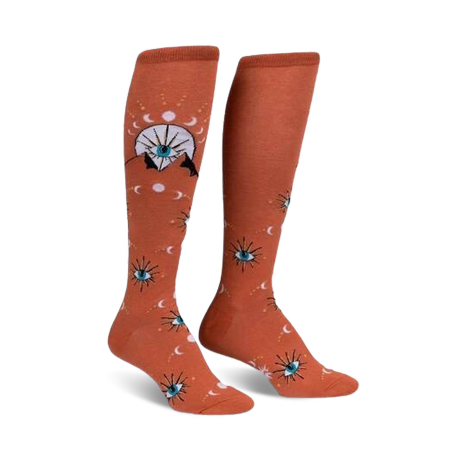 Want socks that keep you looking up at night? These Mystic Mountain socks feature a hypnotic pattern of bright blue eyes, white moons, and yellow stars against an orange backdrop. Wear them and feel the cosmos take you away!