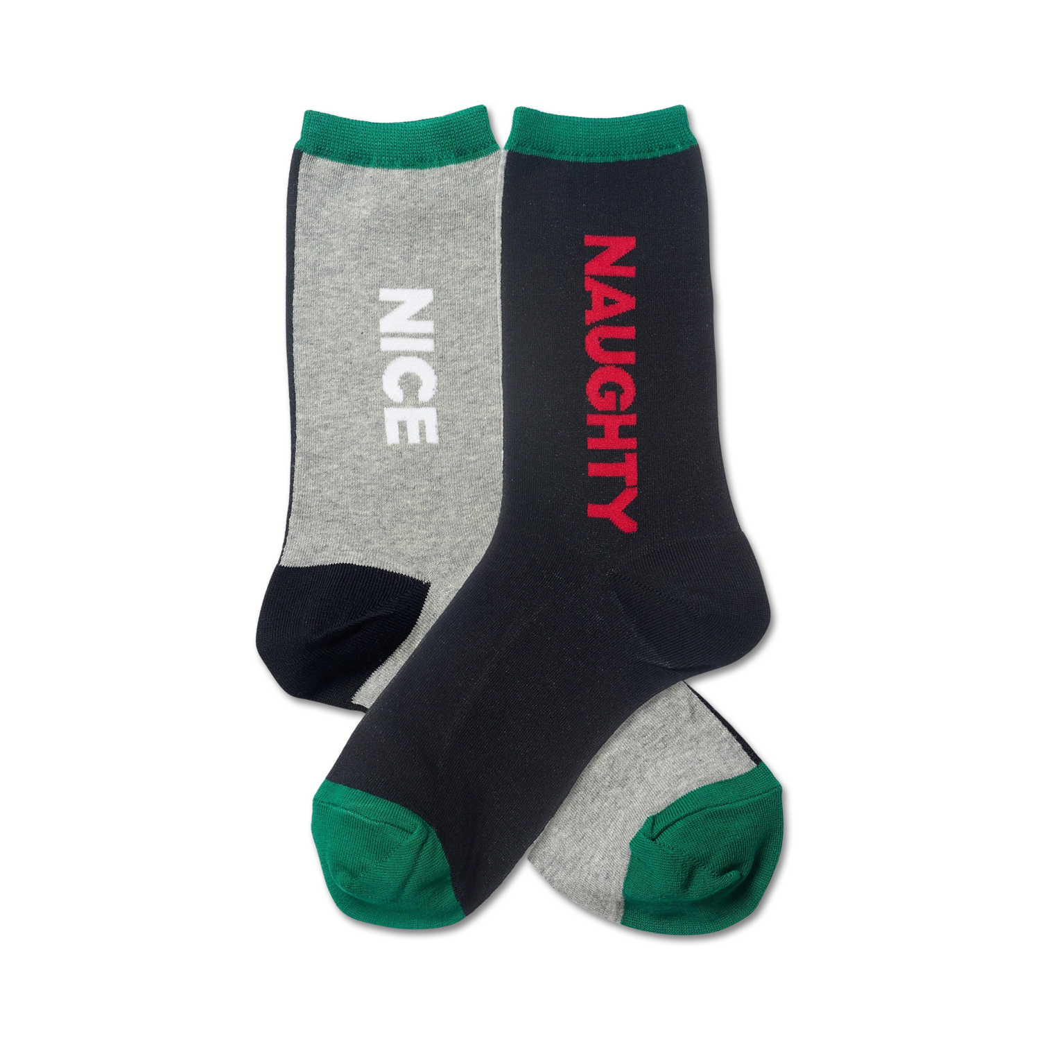 The naughty and nice crew socks are the perfect gift for the person who has everything. They will make everyone smile with their festive holiday vibes, and with their bold font, bright colors, and contrasting black and gray you are sure to be on someone