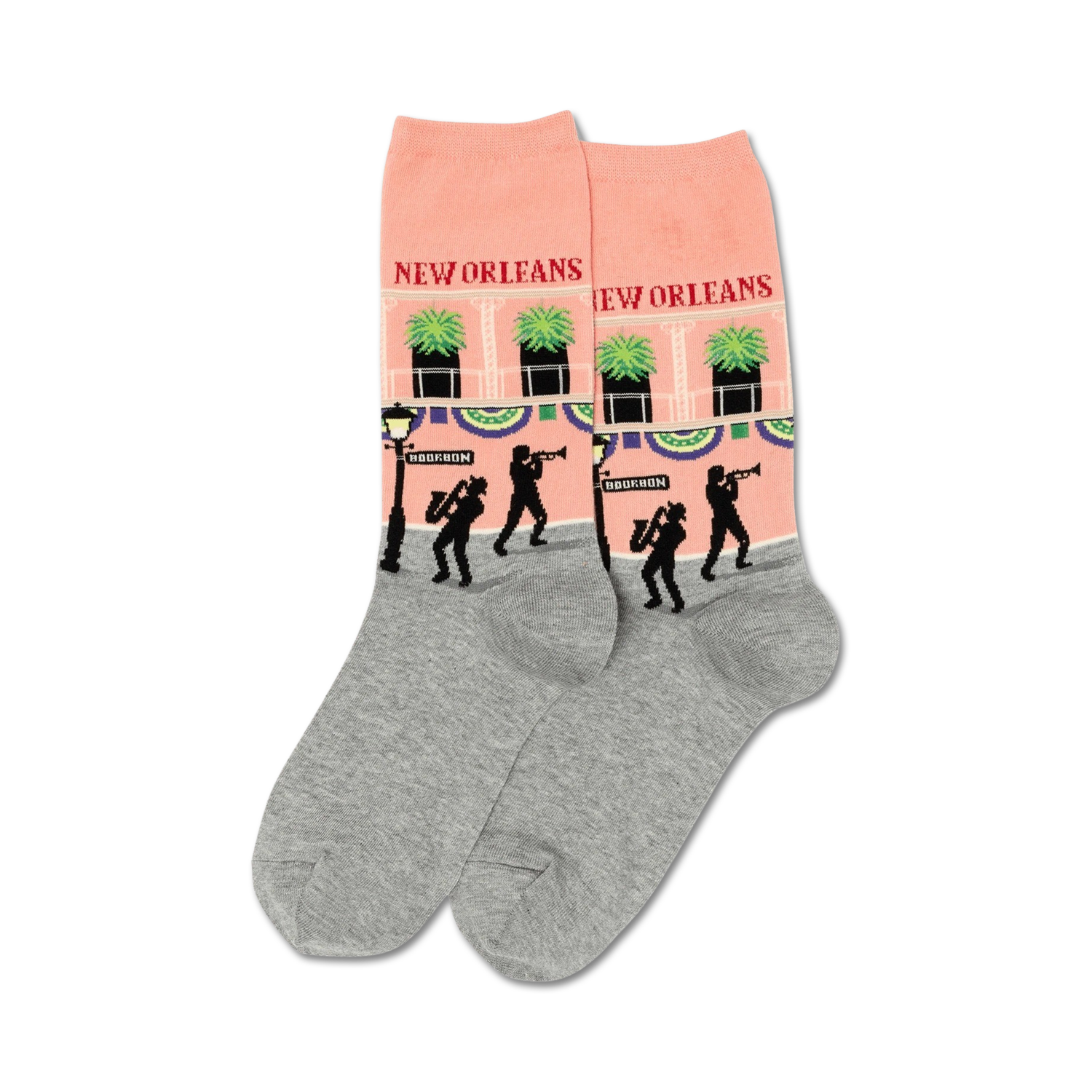 New Orleans socks: These vibrant pink and gray crew socks are perfect for anyone who loves the Big Easy! The cool pattern features images of the iconic Bourbon Street, complete with musicians playing the saxophone and trumpet, palm trees, and balconies. They're sure to turn heads wherever you go, whether you're a local or just visiting. Fun fact: New Orleans is known as the birthplace of jazz and is home to some of the best jazz clubs in the world.