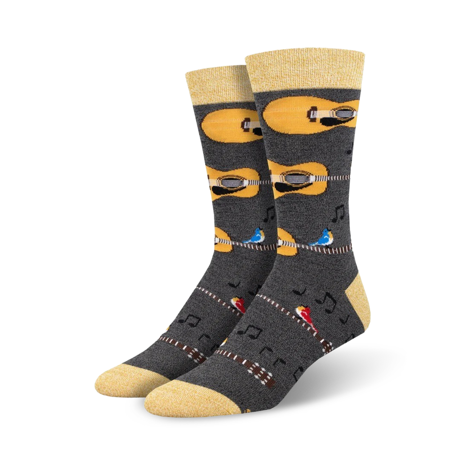 Like a rock concert for your feet, these Nice Acoustics Bamboo socks set the stage for a sock-tacular performance! Picture this: a crew of brown guitars, blue birds, and musical notes, all grooving on your feet in perfect harmony. The yellow top adds a touch of sunshine to your step, while the gray background keeps things grounded. Whether you're hitting the open mic or just rocking out in your living room, these socks will have you feeling like a total guitar hero. They're the perfect way to add some fun and personality to your everyday look. Fun fact: Did you know that Jimi Hendrix played guitar left-handed? So if you're a lefty, these socks are practically made for you!