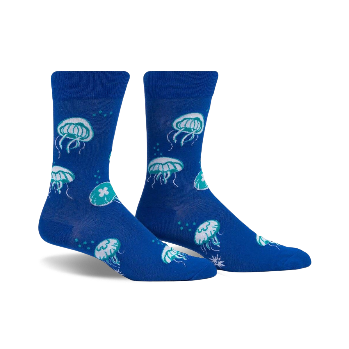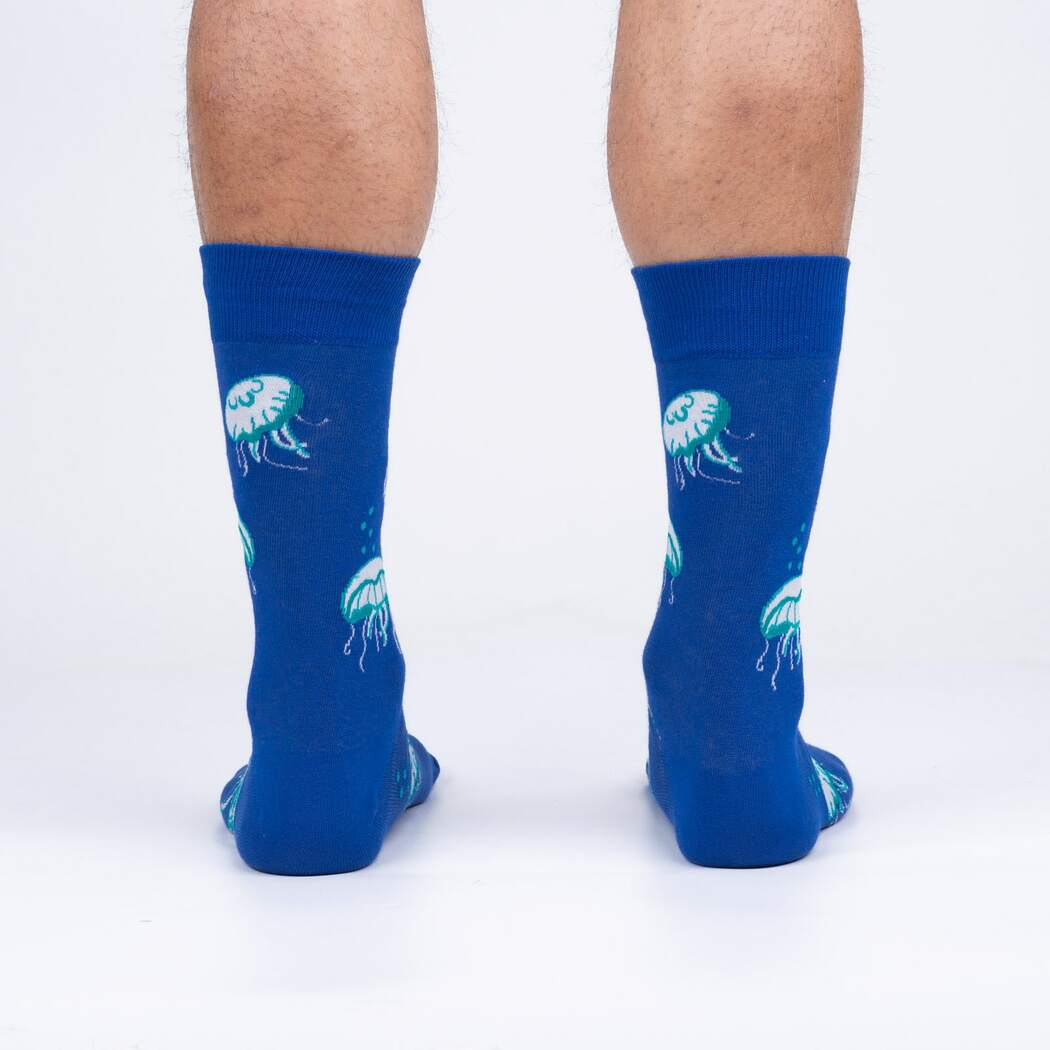 Dive into a sea of comfort with our Nice to Sea You socks! These cool blue socks feature a lively pattern of jellyfish in bright green and pink with white details. Made for men, these crew length socks will be your sea-cret weapon for fun style. Perfect for any ocean lover, they'll make a splash wherever you go.