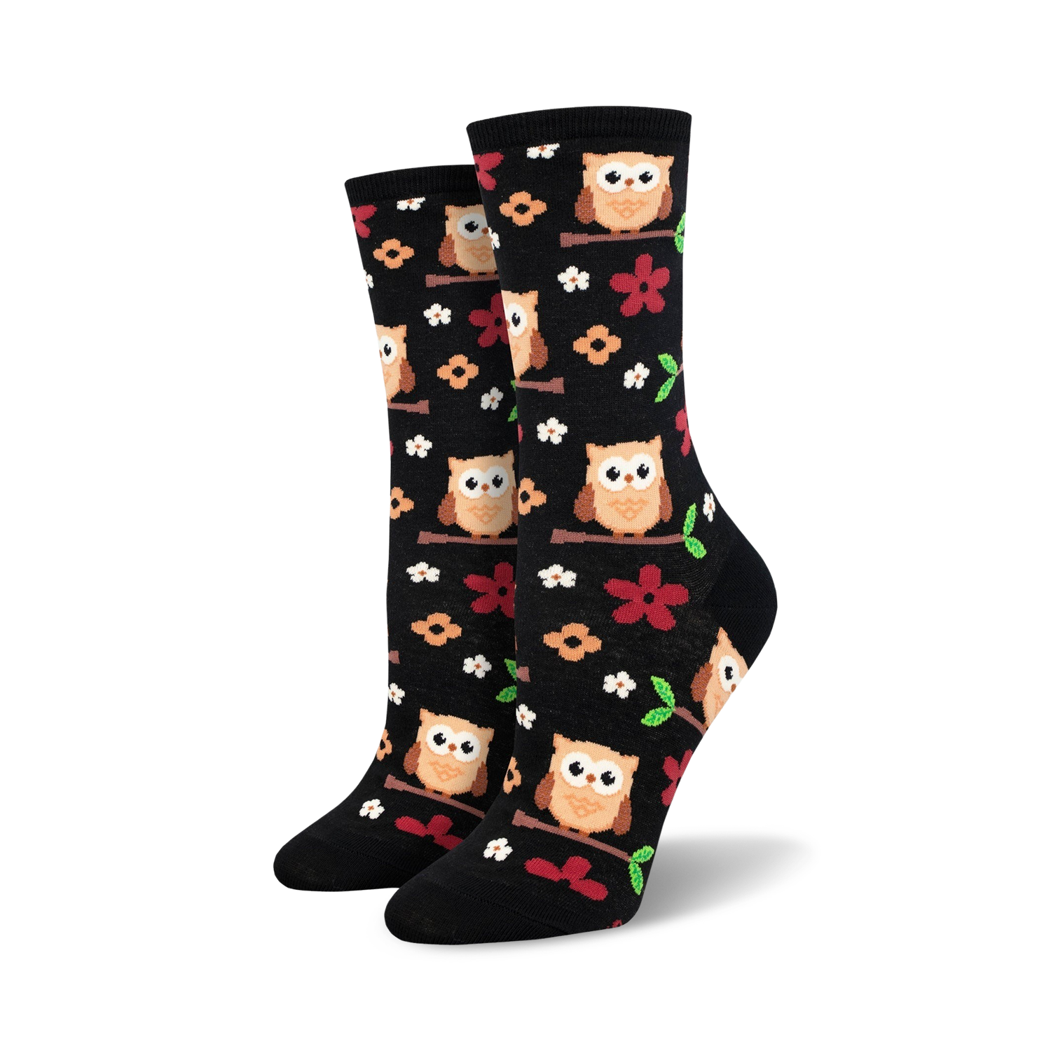 Who sleeps all day and parties all night? The Night Owl! These fun crew socks are covered with cartoon owls with big heads and eyes, perched on branches with green leaves and red, pink, and yellow flowers. Night owls are a hoot!