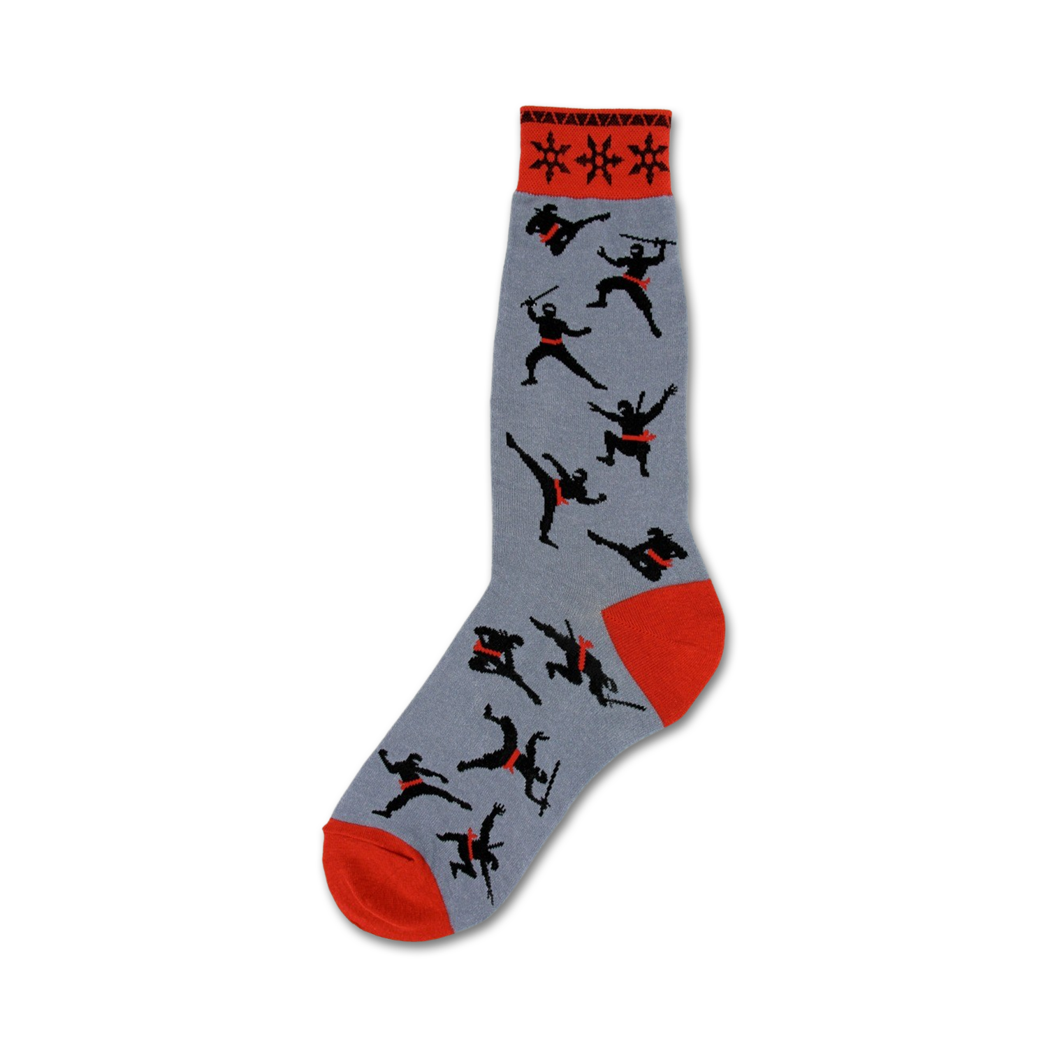 Ninja socks: Sneak attack your feet with these gray crew socks featuring a pattern of black ninjas wearing red headbands and carrying swords. The red toes and heels add a pop of color to these stealthy socks. Perfect for the ninja in training or anyone who wants to add a bit of fun to their sock drawer.