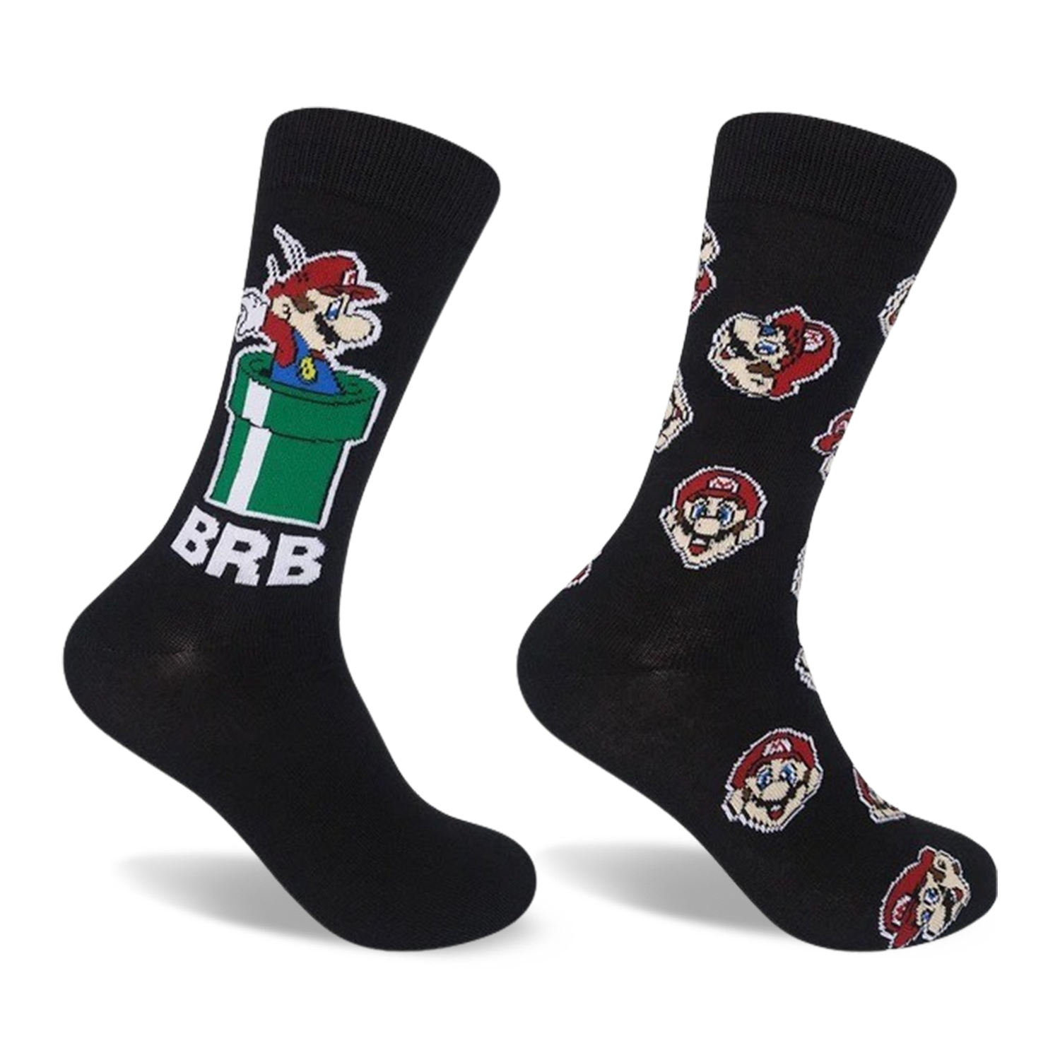 Show your love for Nintendo and the iconic plumber, Mario, with these black crew socks. One sock features Mario popping out of a green warp pipe, while the other sock sports a repeating pattern of Mario's head. Super Mario Bros fans will get a kick out of these socks ”you might even hear a "Yahoo!" or two. Level up your sock game with these Super Mario Bros socks!