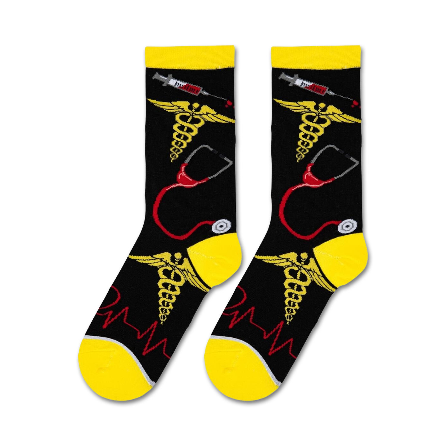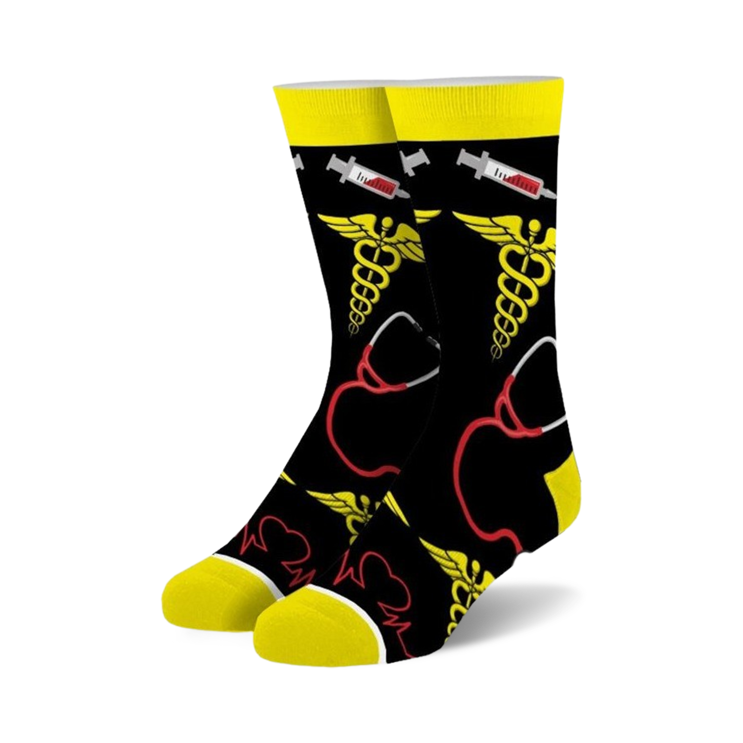 Put on your Nurse socks, the perfect accessory for any medical professional who wants to add a little fun and personality to their work wardrobe. With a vibrant red, yellow, and black color palette, these socks feature a pattern of hearts, caduceus symbols, and syringes. They're made with a comfortable crew length and are sure to put a smile on your face (and your patients' faces) all day long. Remember, you're not just a nurse, you're a superhero, so wear these socks with pride!