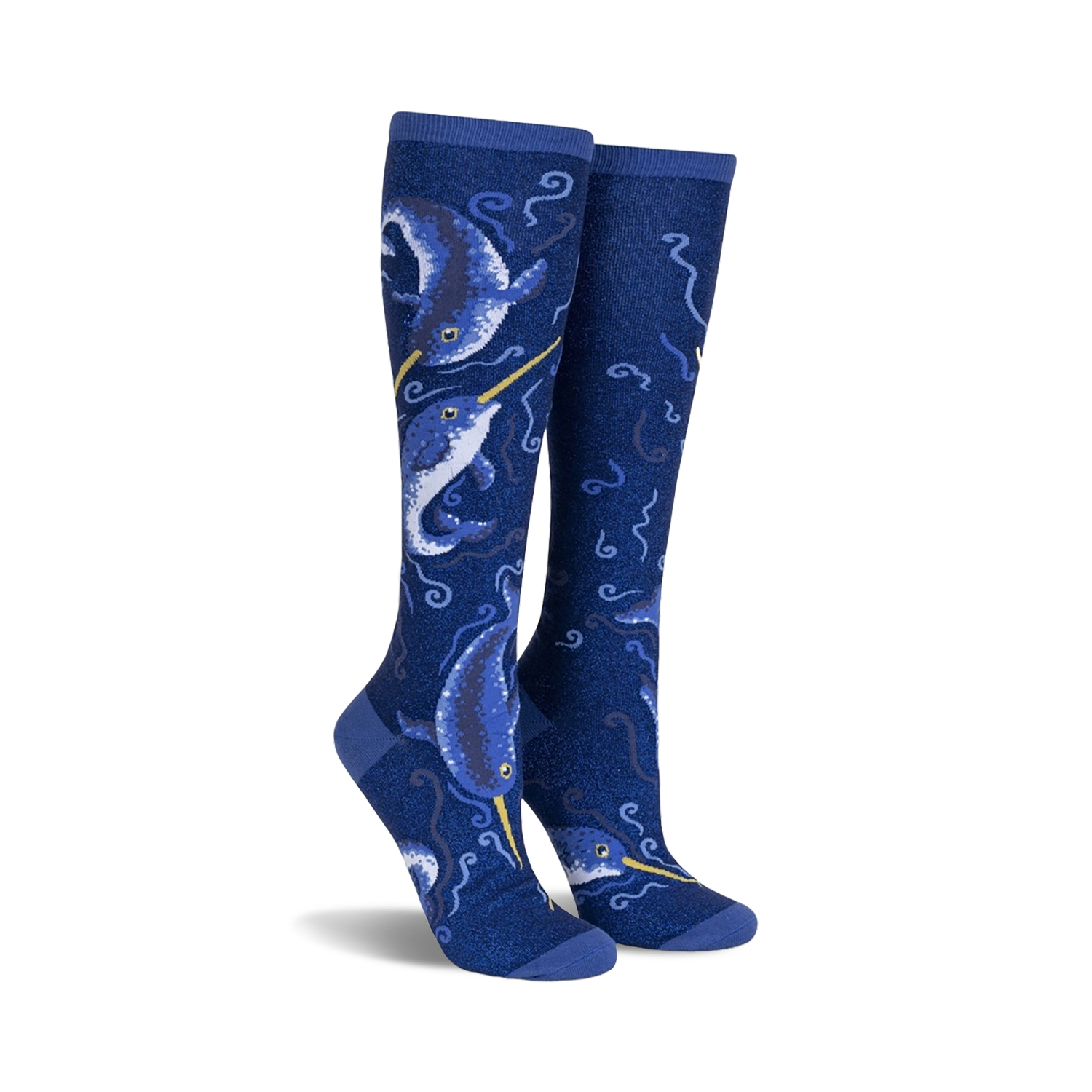 Get ready to plunge into a magical underwater adventure with our Once Upon a Narwhal Shimmer knee-high socks! These dark blue socks are adorned with a whimsical pattern of majestic narwhals with their enchanting spiral tusks and a touch of shimmer that'll make you feel like you're floating through a mystical sea. Dive into a world of wonder and let these narwhals guide you to new depths of style and imagination. Get ready to make a splash wherever you go!