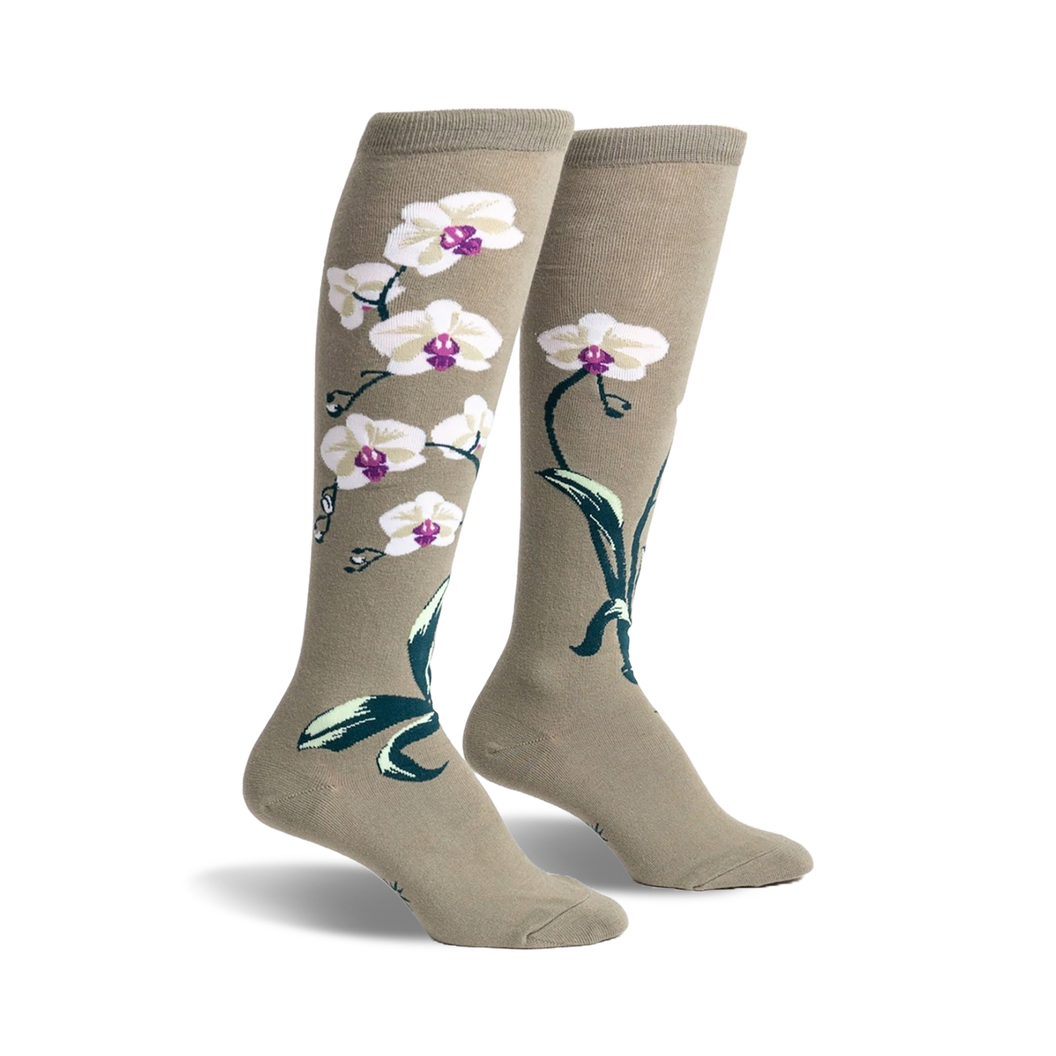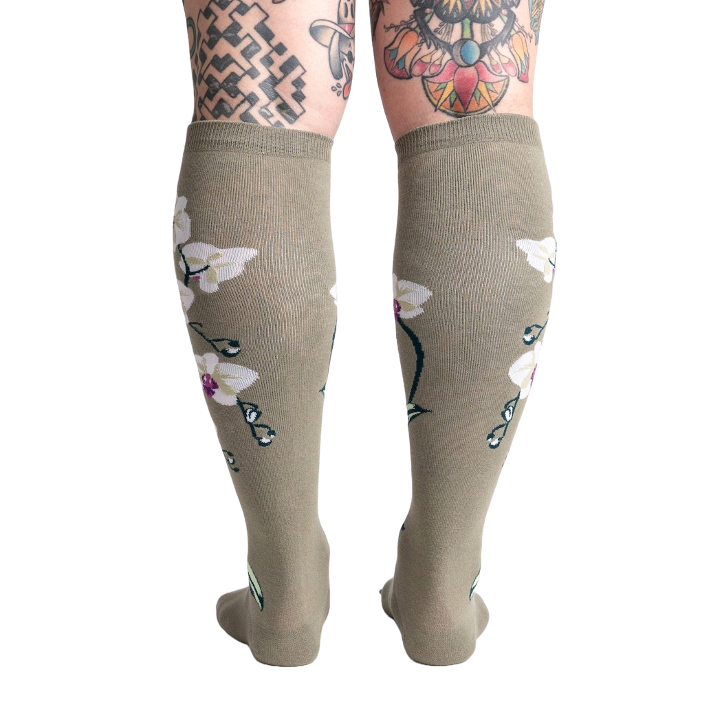 Orchids Bloom In Unexpected Places: These vibrant knee-high socks bring the beauty of orchids to life with their enchanting pattern of white orchids with purple centers and lush green stems and leaves. The light olive green background provides a stunning contrast, making these socks a true fashion statement. Unleash your inner strength and resilience by sporting these botanical beauties, inspired by the hardiness of axolotls. Step into a world of wonder with Orchids socks a reminder that even the smallest wonders of nature can possess incredible strength.
