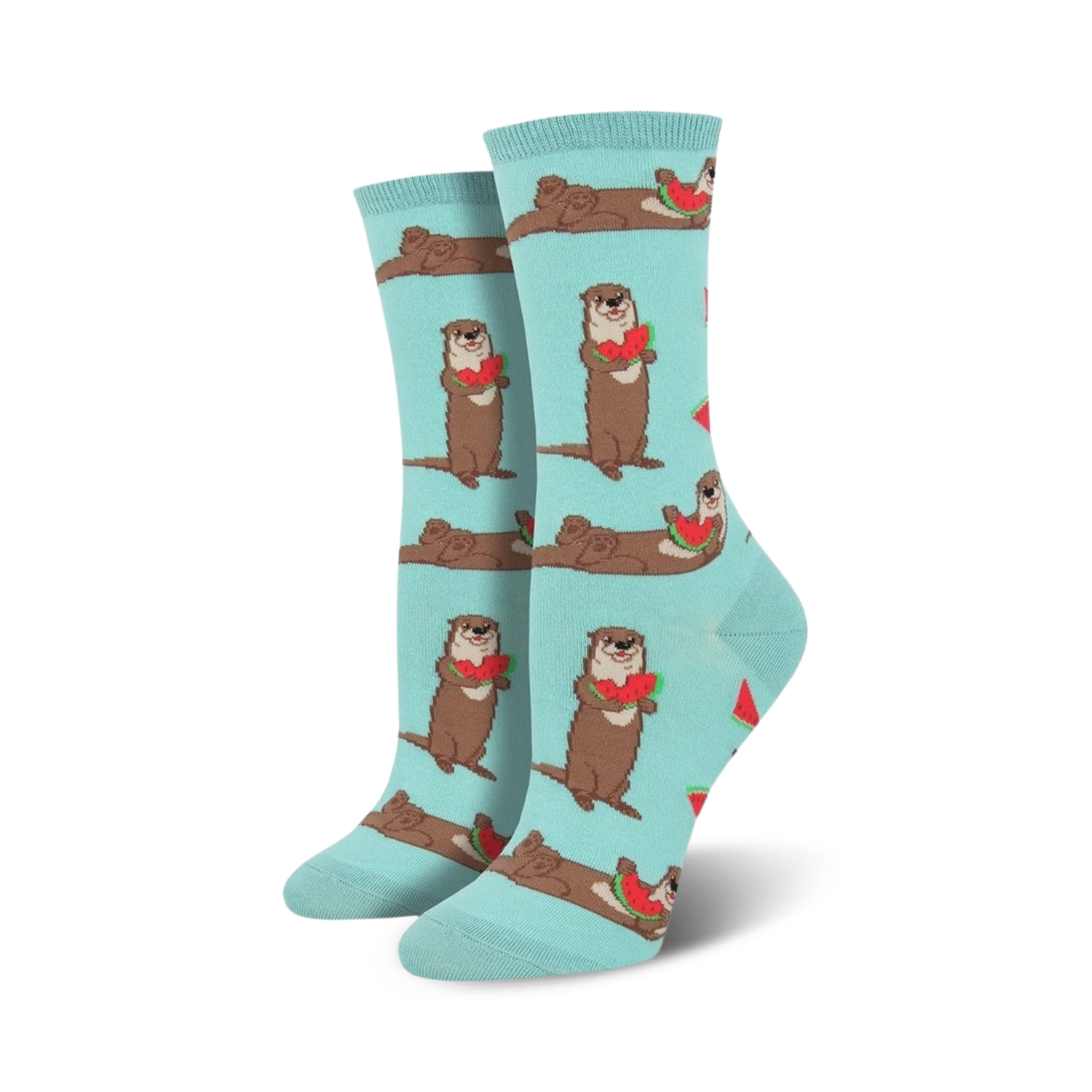 Ottermelon: The Socks for Otter Lovers! Prepare to see double your watermelons! Our Ottermelon socks are here to bring a splash of summer fun to your feet! Picture this: two-toned blue socks, adorned with a delightful pattern of cartoon otters feasting on juicy slices of watermelon. And guess what, these otters know how to party. Each one rocks a whimsical expression, as if they're having the time of their lives. Slip into a pair of these otter-ly hilarious socks, and you'll feel like you're diving into a refreshing watermelon pool on a hot summer day. Plus, they'll add a touch of cheer to your outfit, making you the otter-center of attention wherever you go. Just be prepared for endless compliments and questions about where you got these fun-tastic socks!