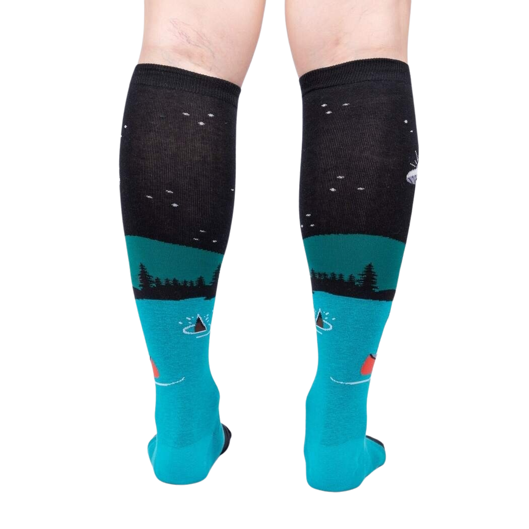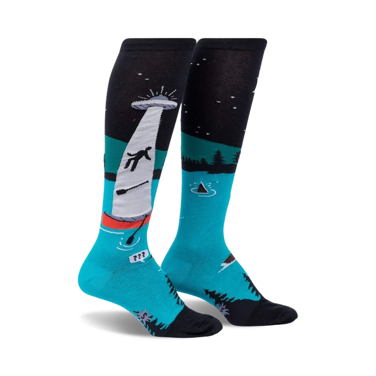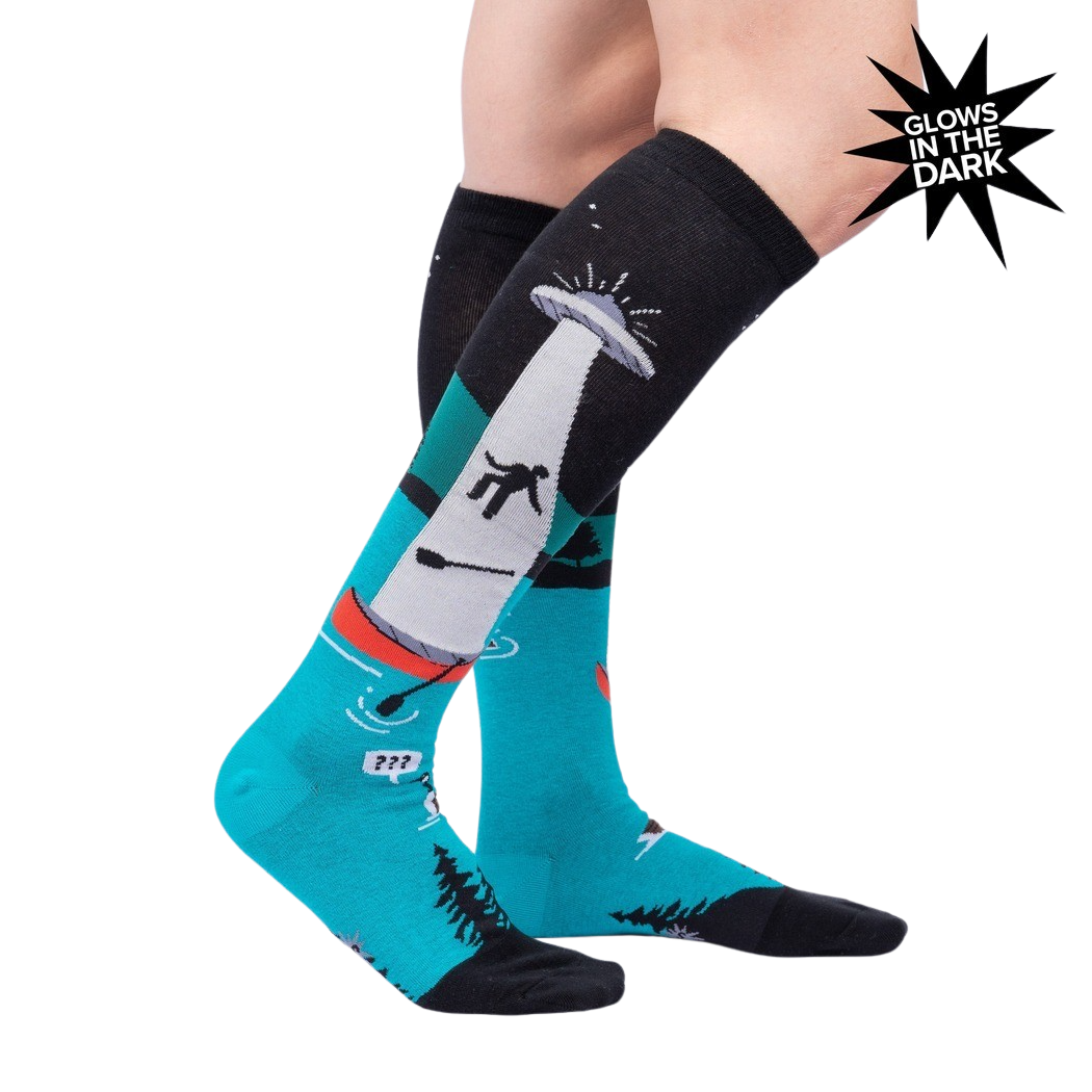 Let your feet join the cosmic fun with our "Out of Boaty Experience" socks! These eye-catching knee-high socks for women feature a hilarious pattern of a person in a boat getting abducted by a UFO with a glowing green light, surrounded by trees. The socks' glow-in-the-dark feature adds an extra dash of excitement, making them perfect for those who love a bit of mystery. Slip into a pair and embark on an intergalactic adventure with every step!