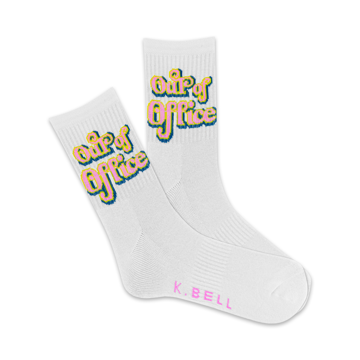 Put your best foot forward (literally) with our Out of Office socks for women. These crew-length socks are soft, cozy, and feature a bold, white design with the words "Out of Office" emblazoned across them. Whether you're actually out of office or just dreaming of a tropical vacation, these socks will keep your feet happy and stylish. Plus, they're sure to make a statement.