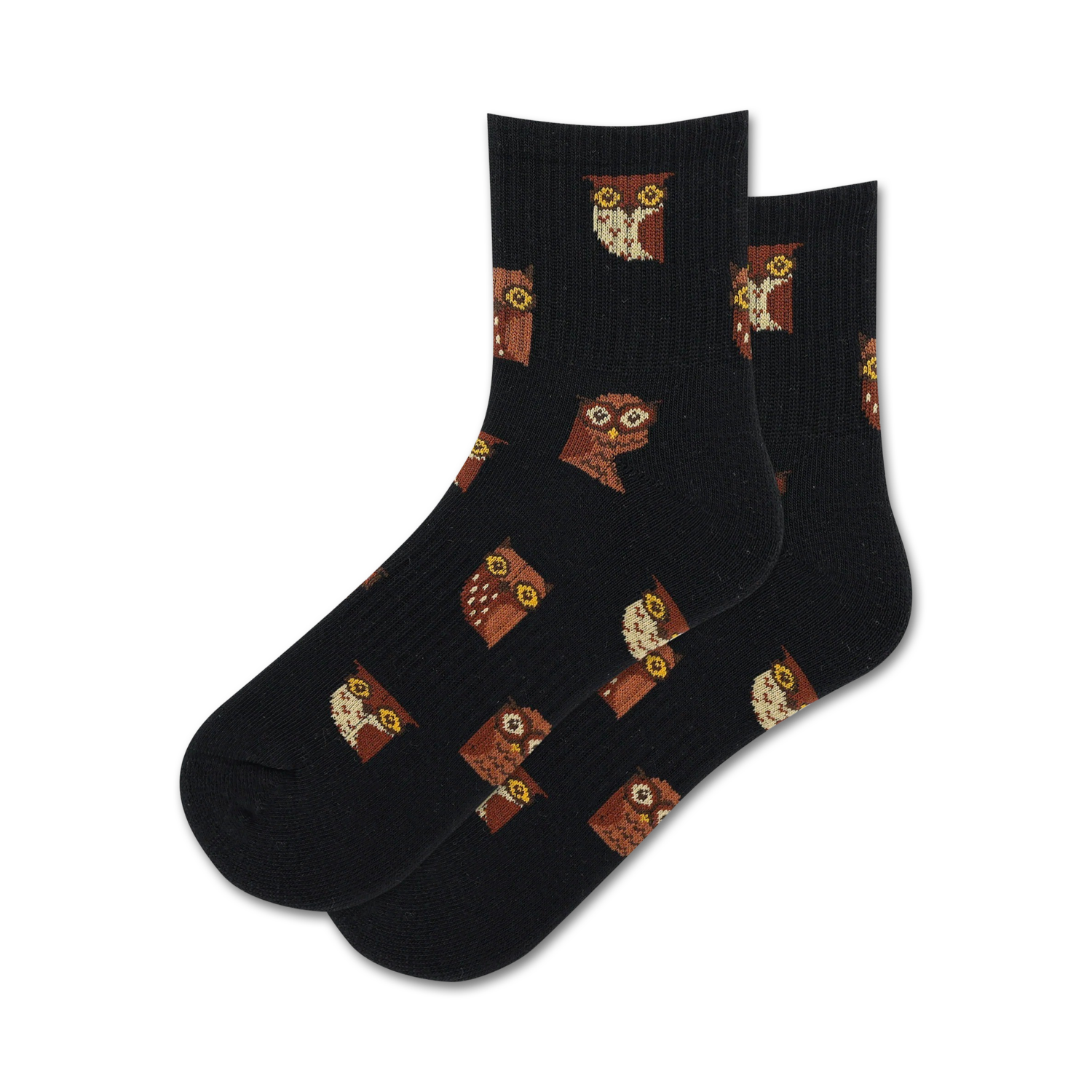 Novelty Owl Ankle Socks: Look who's hooting to get on your feet! Our Owl Ankle Socks are covered in a grid pattern of cartoon owls with big brown eyes and fluffy white bellies. These socks are perfect for any owl lover or anyone who wants to show off their quirky side. Fun Fact: Owls can turn their heads 270 degrees in either direction. With these socks, you'll be the hoot of the party!