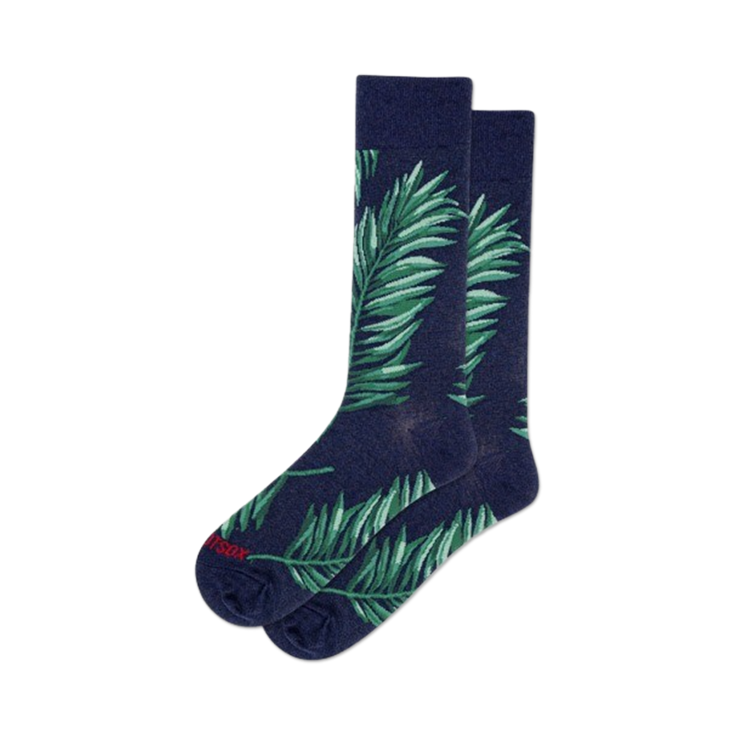 You know how palm trees sway in the breeze, bringing to mind images of sandy beaches and crystal-clear waters? Well, say hello to the Palm Leaf socks your new favorite accessory to transport you to paradise! These bad boys are made for adventurous souls who appreciate the finer things in life, like a good time and feeling comfy from head to toe! Let your feet soak up that tropical island vibe in these crew-length socks, featuring an all-over pattern of green palm leaves on a dark blue background. So go ahead, take a walk on the wild side and let these socks turn your ordinary steps into a vacation-like strut!