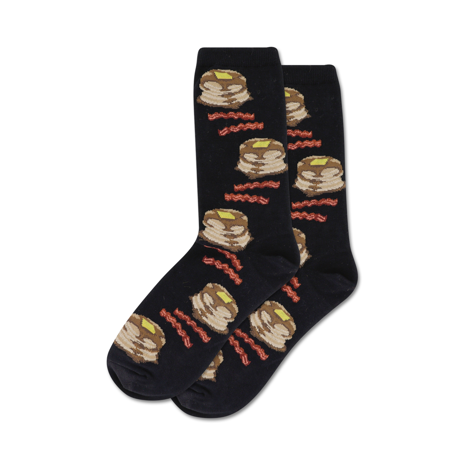 Dig into breakfast-themed novelty socks with a pattern of fluffy pancakes, crispy bacon, and sizzling butter on a pitch-black backdrop. Channel your inner chef and strut your stuff in these crew-length socks designed to satisfy your hunger for fun and fashion.