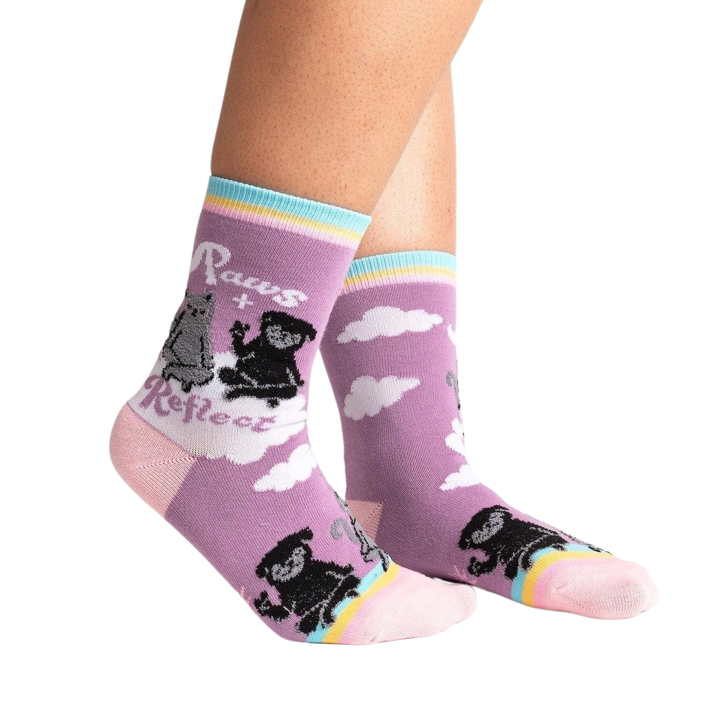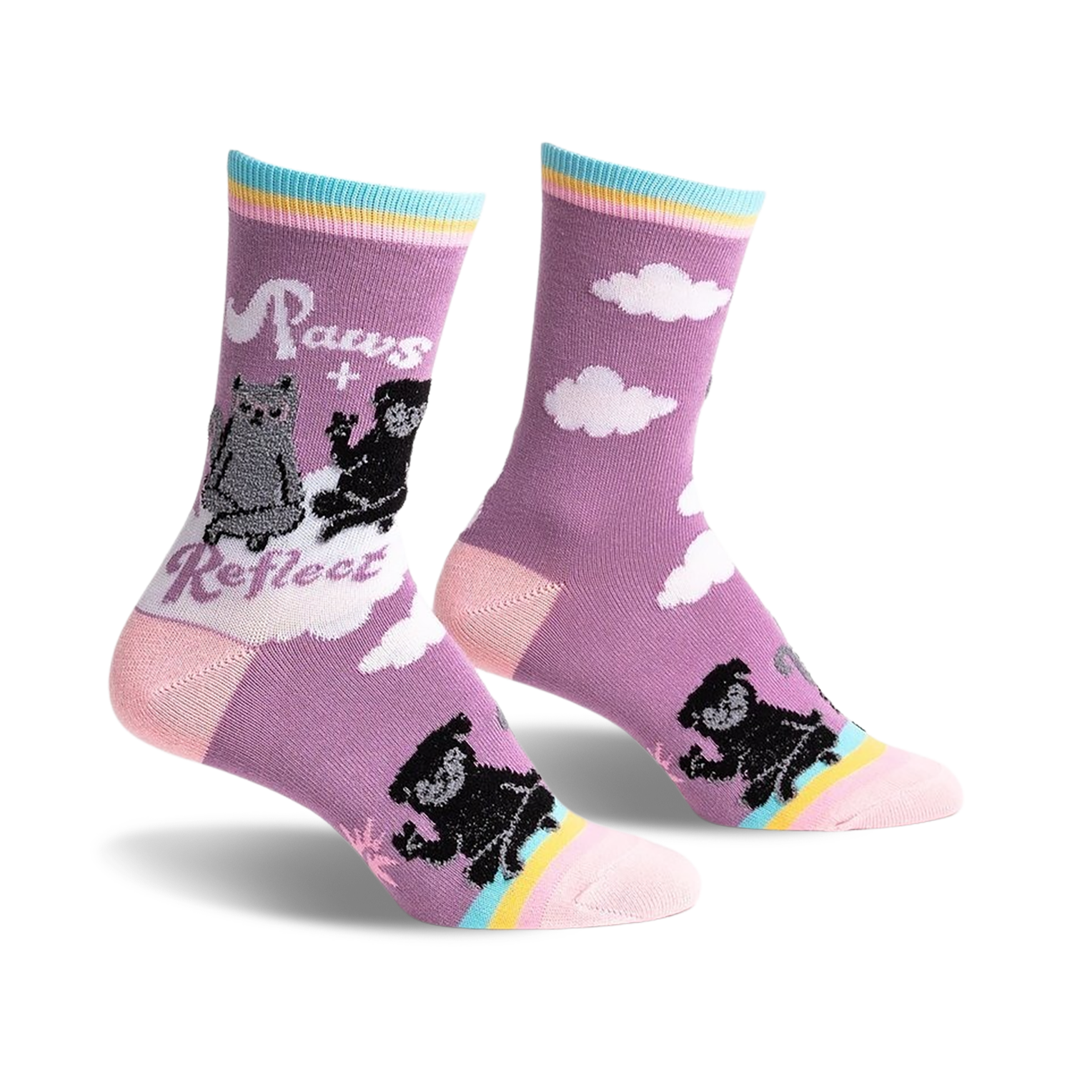 Paws + Reflect socks: Mew-ve over boring socks! These crew socks feature two adorable kitties sitting back-to-back, surrounded by a rainbow, clouds, and the words "Paws + Reflect." They're purr-fect for anyone who loves cats and fun socks. Plus, a portion of the proceeds from each sale goes to help cats in need. Get ready to show off your paws-itive style!