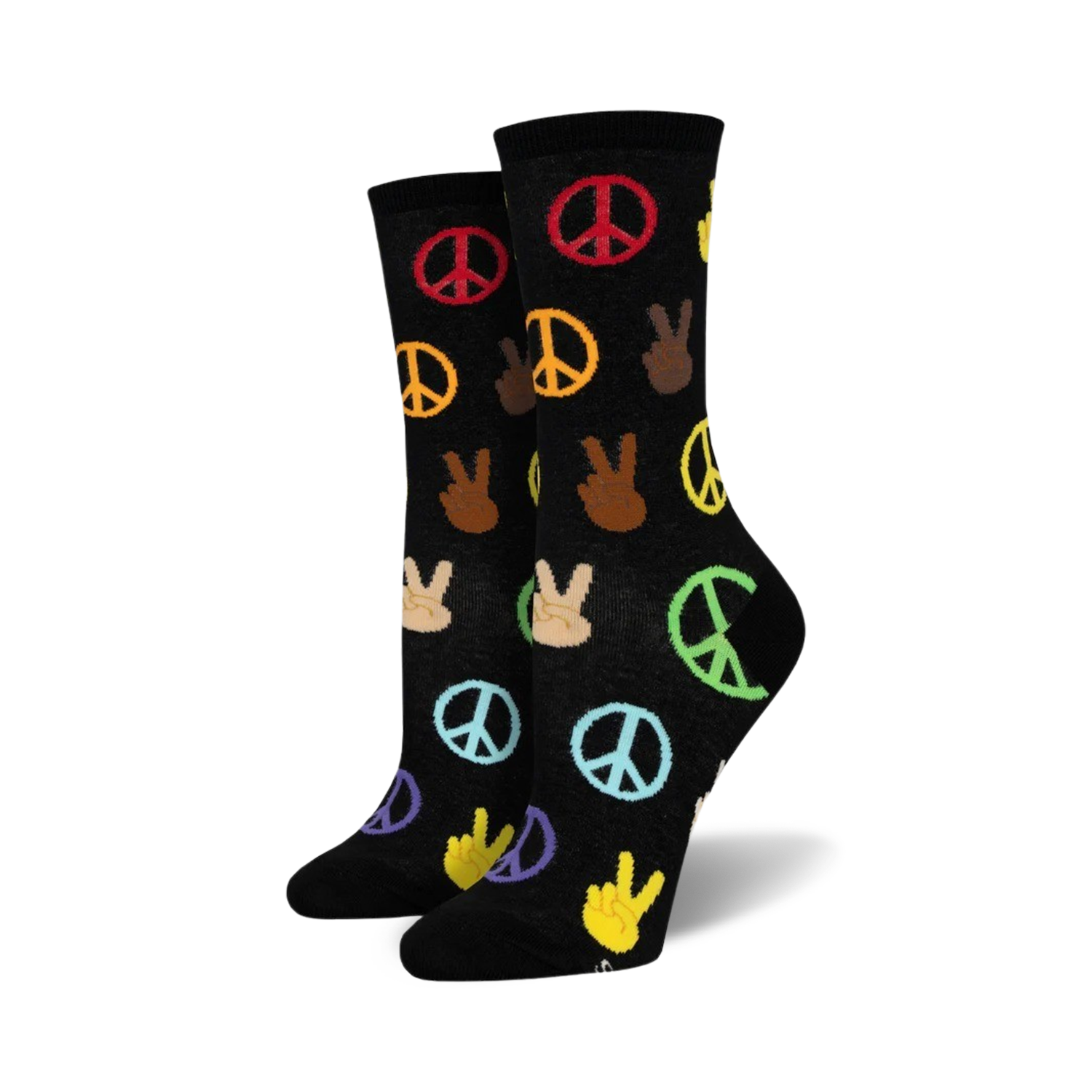 Show off your love for peace and unity with these fun and funky black crew socks, featuring a vibrant pattern of multi-colored peace signs and hands making the peace sign in various skin tones. These socks are perfect for spreading positive vibes wherever you go. They also come in a variety of sizes to fit your feet perfectly. Be a walking billboard for living in harmony and having good times, one step at a time!
