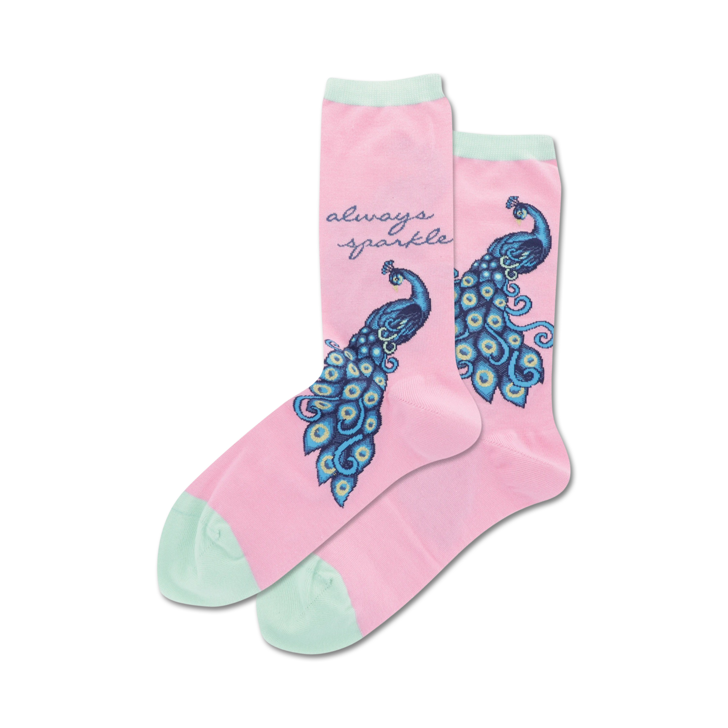 Strut your stuff in these 'Peacock' crew socks! Adorned with eye-catching blue, green, and yellow peacocks and the message "Always Sparkle." These fun socks got the beat and rhythm to make your feet move and groove! They are the perfect accessory to add a splash of color and personality to any outfit, reminding you to 'Always Sparkle'!