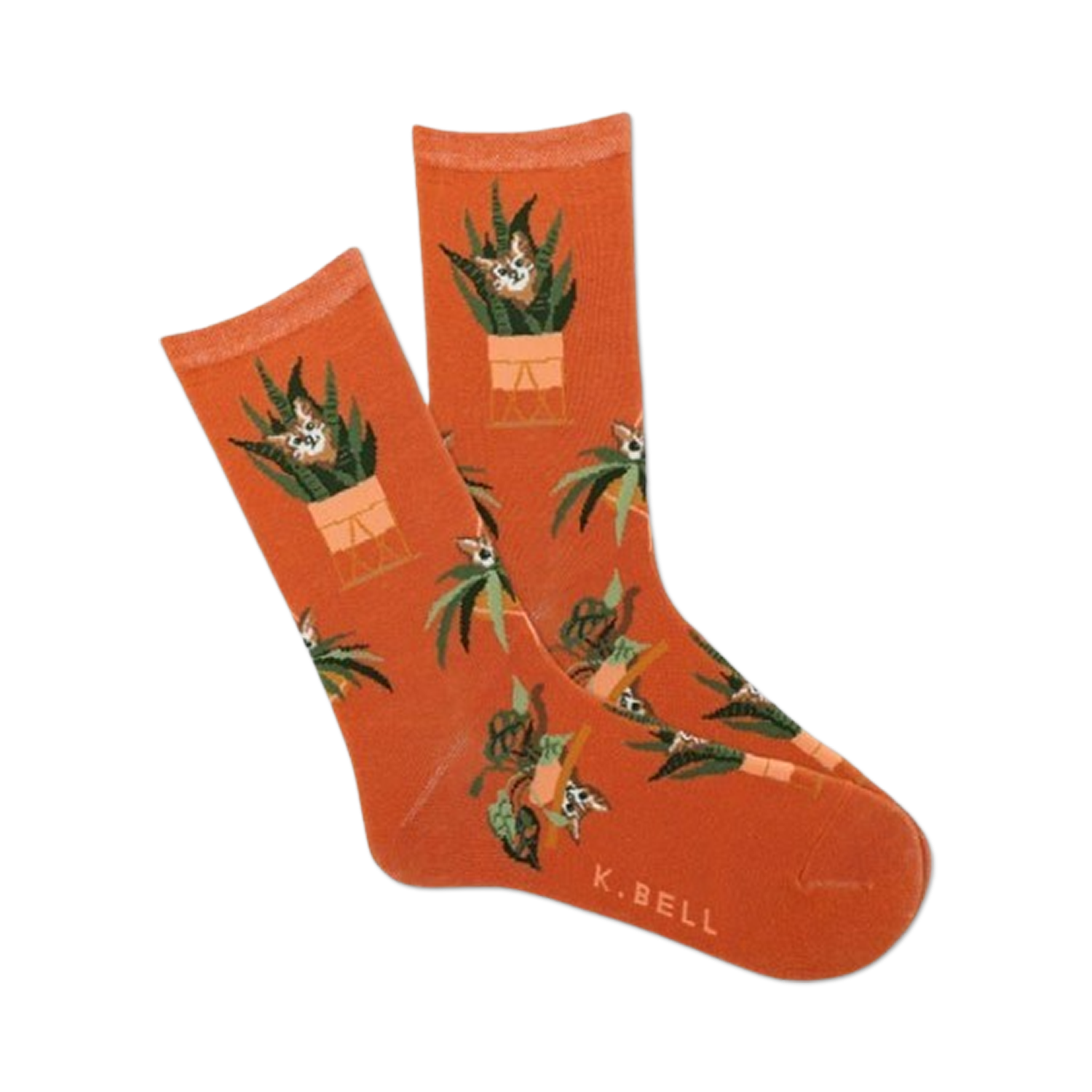 Peeking Cat Socks: Meet our playful felines! These crew-length socks made for women feature a captivating pattern of potted plants with adorable gray and white cats peeking out. The vibrant orange backdrop and lush green plants create a whimsical touch that'll brighten up your day. These socks aren't just eye-catching but ultra comfy too, perfect for cat enthusiasts and anyone who loves a pop of fun in their sock drawer.