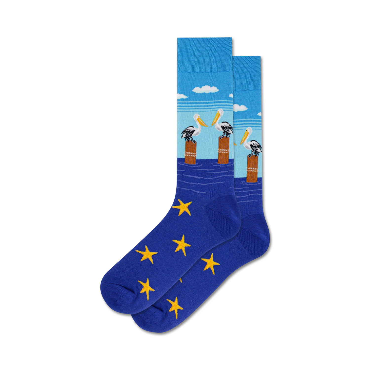 Pelicans on Posts Socks: Make a splash with these vibrant crew socks featuring a school of pelicans perched atop sturdy posts amidst a rough sea. These blue socks are a lighthearted reminder that even in the roughest of waters, pelicans can find their footing. Like you, they're sure to stand tall and fly high no matter the obstacles in your way. Soar into style with these fun pelican socks!