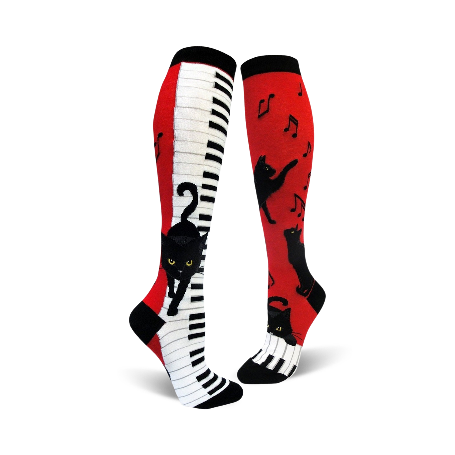 Get your paws on the Piano Cat socks, a musical masterpiece in knee-high fashion. Picture this: a chorus of black cats tickling the ivories on a piano keyboard, surrounded by a symphony of red musical notes. You'll be the talk of the town or, should we say, the meow of the town. Put on these socks and let your feet take center stage. So, release your inner rockstar. Strut your stuff in these paw-some socks and hit those high notes with every step.