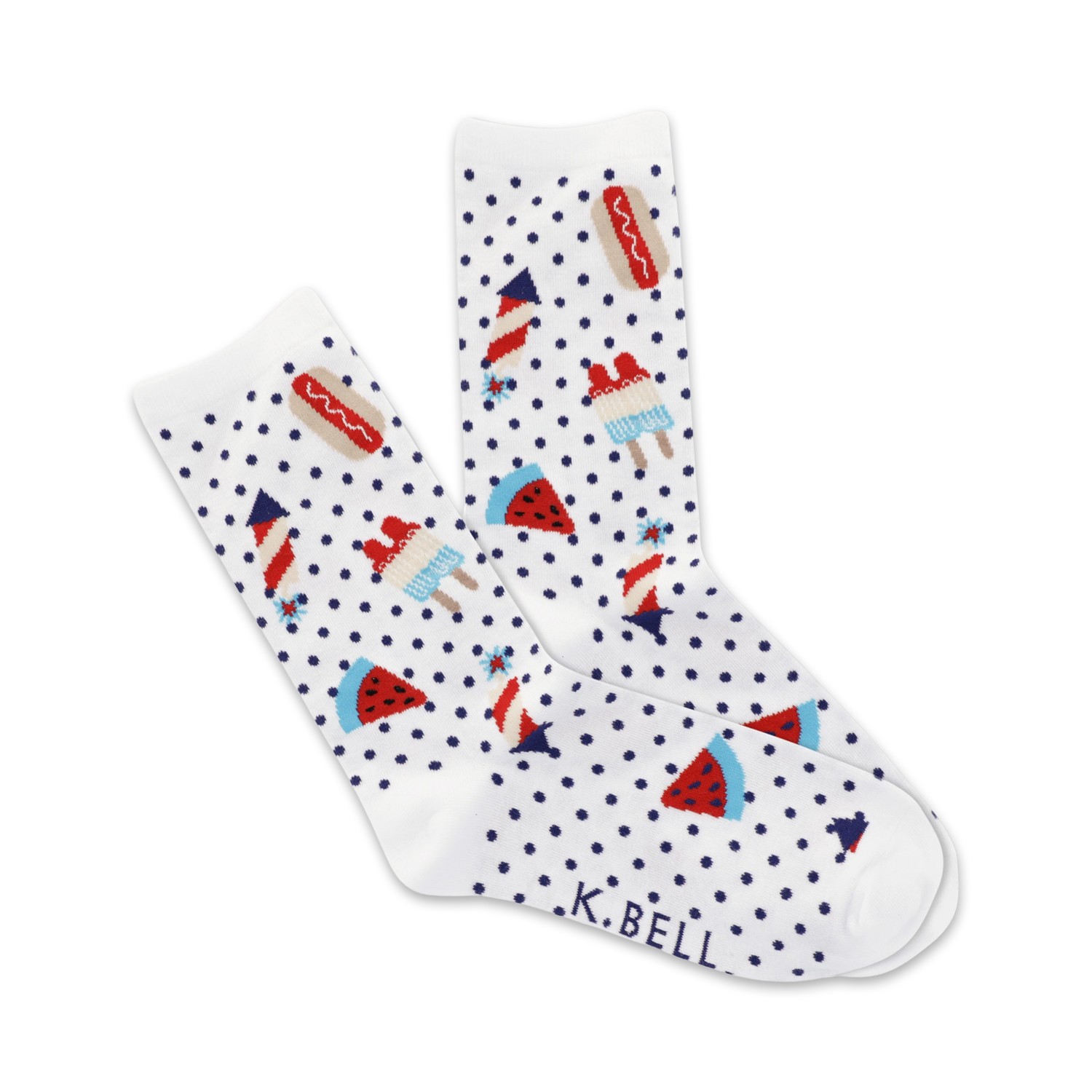 Picnic dreams come to life in these white crew socks with red, blue, and green hotdogs, popsicles, watermelon slices, fireworks, and more. Whether you are enjoying a picnic or dreaming of one, surrounding your toes with carnival delights is sure to bring happiness to any day. Show them your wild side and wear these socks to your next BBQ, pool party, or tailgate!