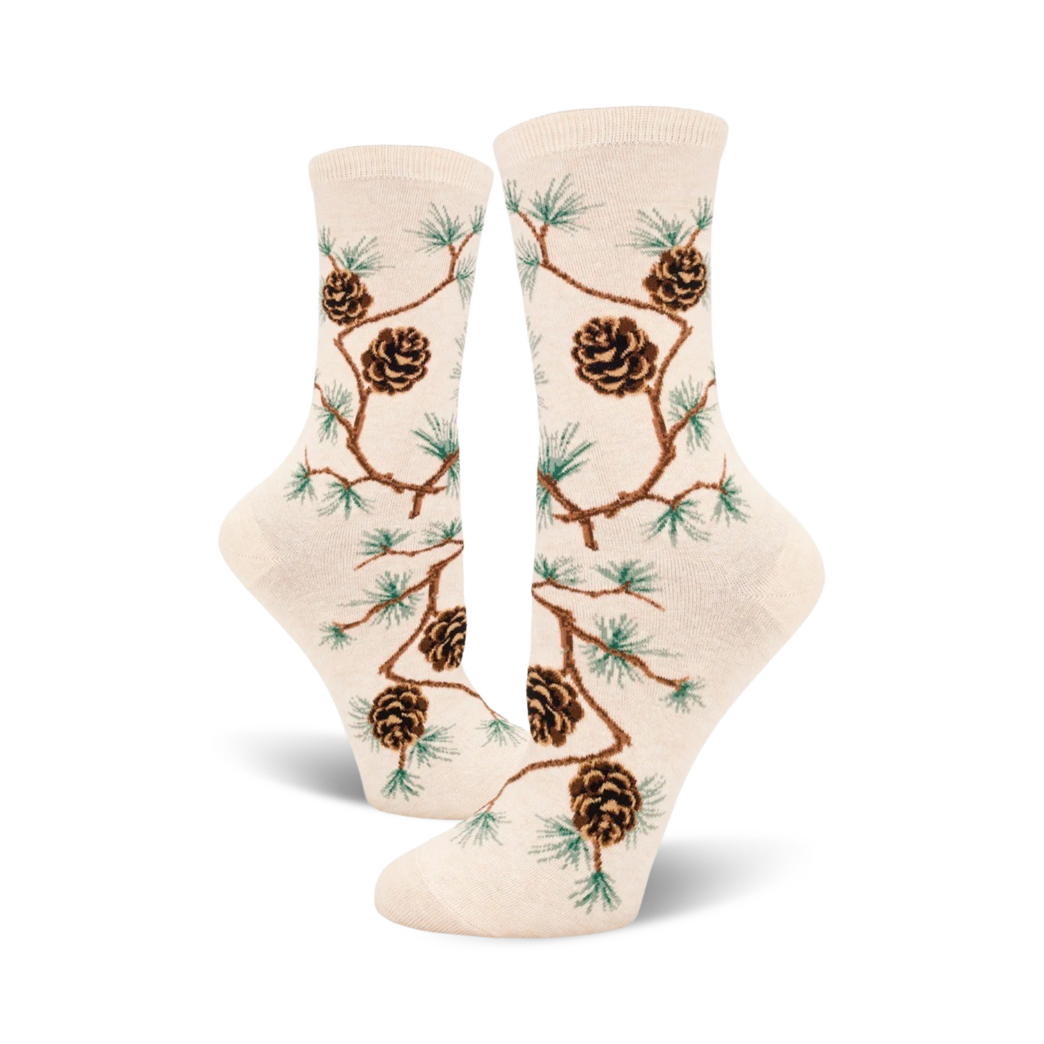 Pinecone Crew Socks for Women: Embrace the spirit of the forest with these delightful socks adorned with pinecones and green pine needles on an off-white background. These socks, aptly named "Pinecone," bring a touch of nature's charm to your everyday wardrobe. Crafted with a comfortable crew length, they're the perfect blend of style and coziness. After all, who doesn't love the smell of fresh pine on a crisp autumn morning? Grab a pair and let the forest vibes elevate your everyday adventures!