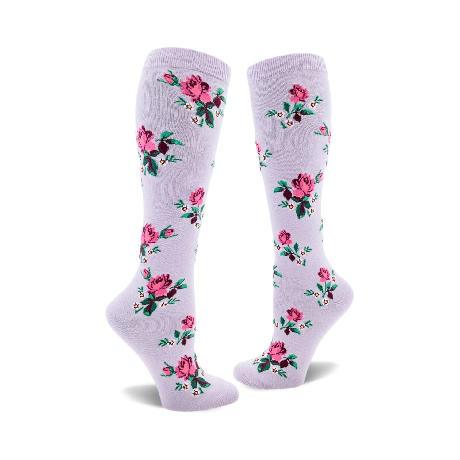 Brighten up your sock drawer with our Pink Rose knee-high socks! Decked out in a playful light purple hue and dotted with a charming sprinkling of pink roses, green leaves, and white flowers, these socks are a burst of botanical beauty. Their knee-high allure pairs perfectly with your favorite skirts or adds a pop of color under trousers. From garden parties to lazy Sunday brunches, let your feet bloom wherever you roam. Why walk when you can parade in style?