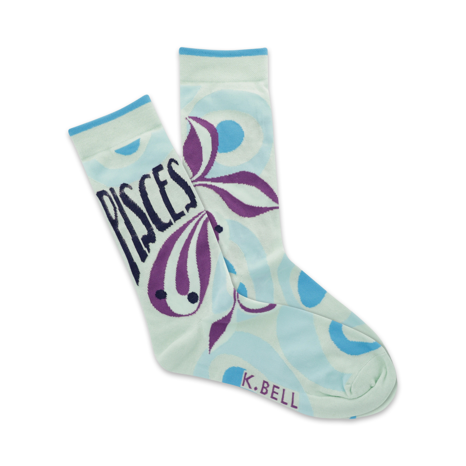 Dive into the cosmic realm with these Pisces socks! Pisces season swim through dreams, emotions, and creativity. With their light blue background, purple fish, and blue and white bubbles, these socks will make you feel like you're floating through the celestial sea. So, slip on these Pisces socks and let your imagination sail away.