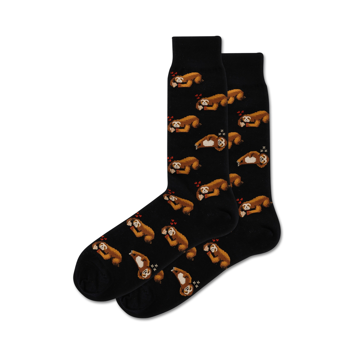 Embrace your inner sloth with our Pizza Sloth socks. These crew-length mens socks feature a charming pattern of brown sloths holding red heart-shaped pizzas in their arms. With cream-colored faces, arms, and black claws, these sloths are sure to bring a smile to your face. Wear them as a reminder that even the slowest-moving creatures can have a love for pizza.