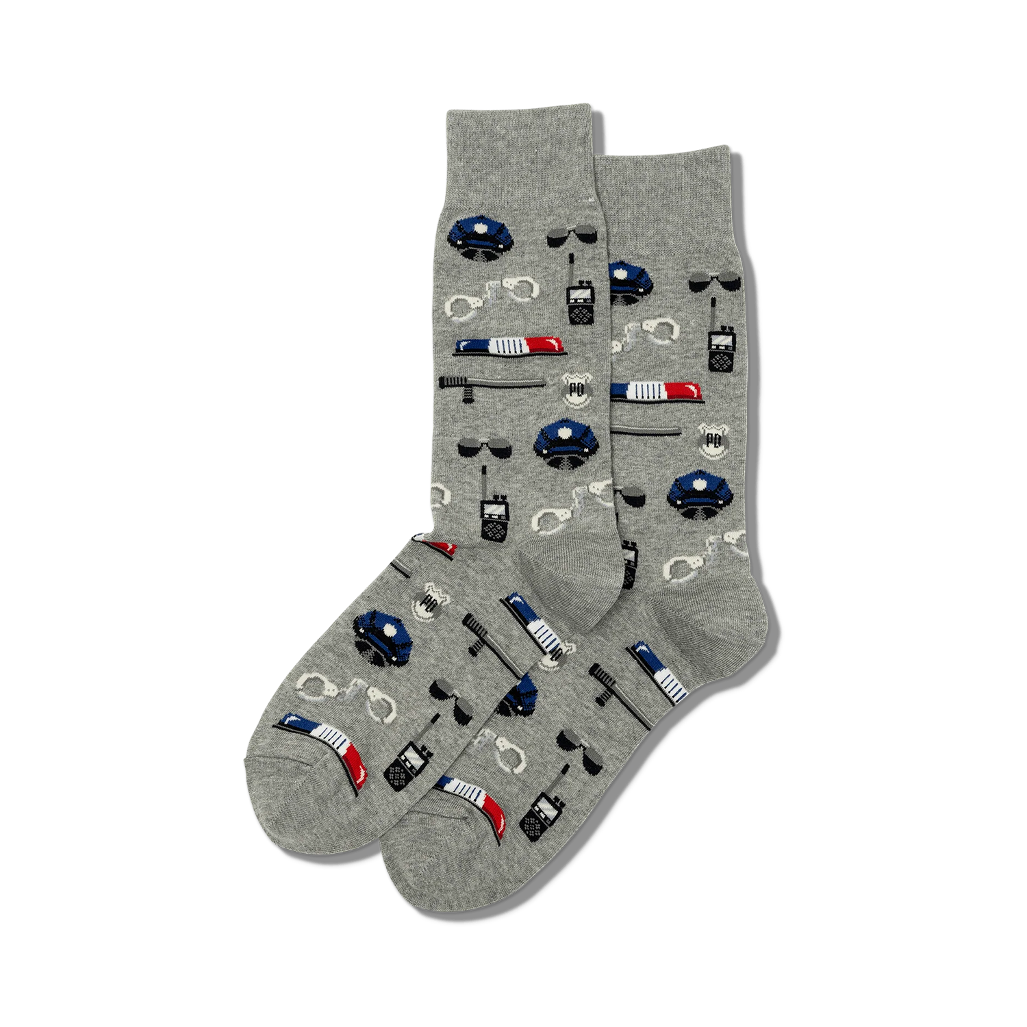 Hey sock heads! Get ready to add some law and order to your feet with our new Police novelty socks. These gray crew socks feature a fun pattern of handcuffs, police hats, billy clubs, and walkie-talkies. Show your appreciation for the men and women in blue or just add some fun to your everyday look. Remember, these socks are not just for cops they're for anyone who wants to bring some crime-fighting style to their feet. Talk about a sock-busting good time!
