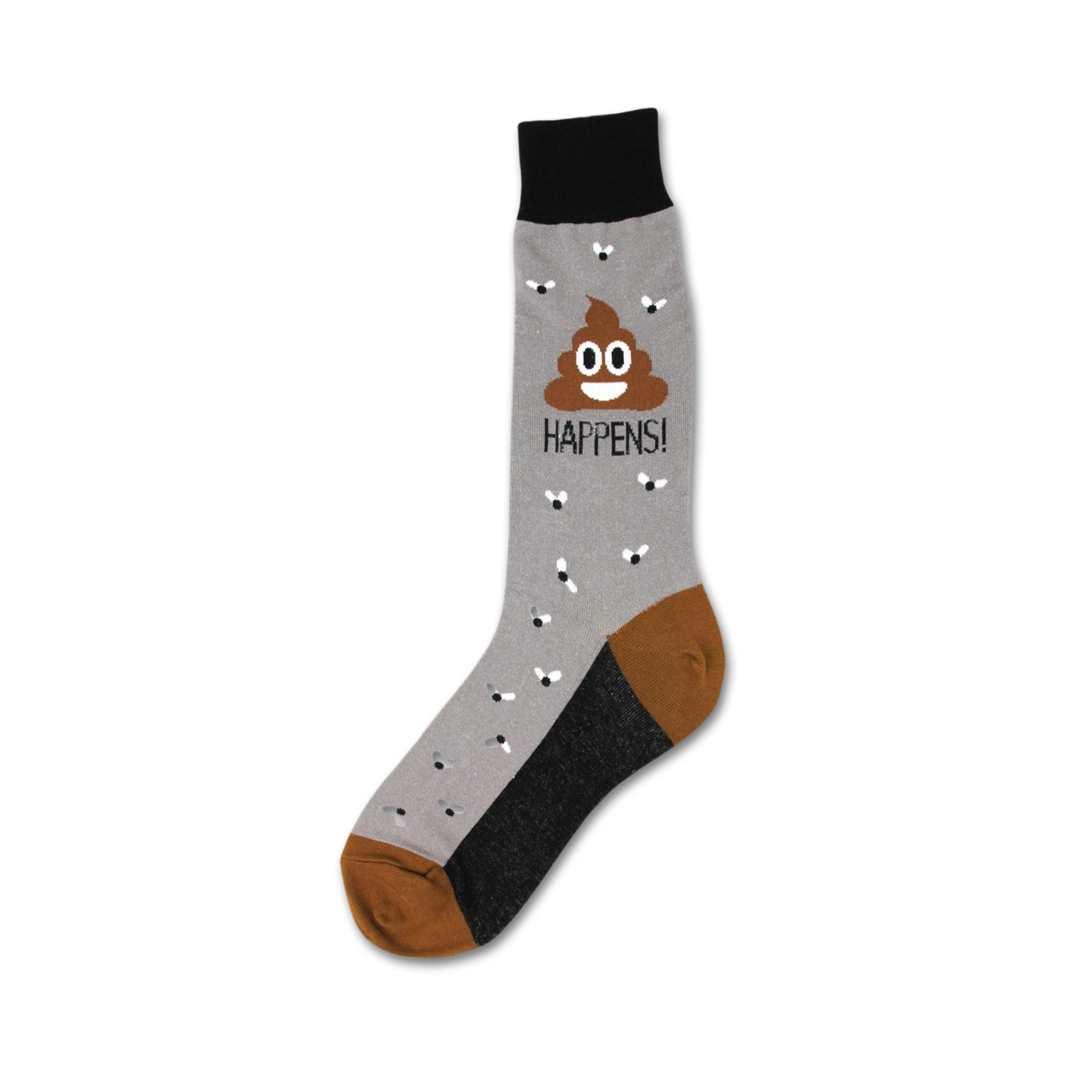 Poop Happens Novelty Socks: Dive into a world of whimsical comfort with our Poop Happens socks! These gray socks with a brown poop emoji and black flies are like a lighthearted reminder that even life's messy moments can be amusing. Rock them casually or brighten up formal wear.