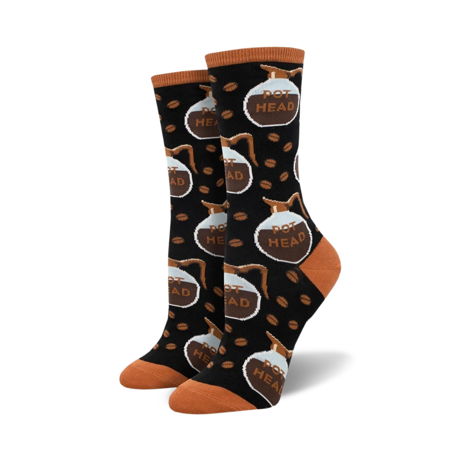 Coffee lovers, hold your mugs! We've brewed up a fresh batch of fun with these Pot Head coffee bean socks. They're a blend of humor and coziness, so you can keep your feet warm and caffeinated all day long. The black socks are covered in a pattern of brown coffee beans and the words 'Pot Head' in a circle. So, whether you're a home brewer or a coffee connoisseur, these socks will keep you grounded.