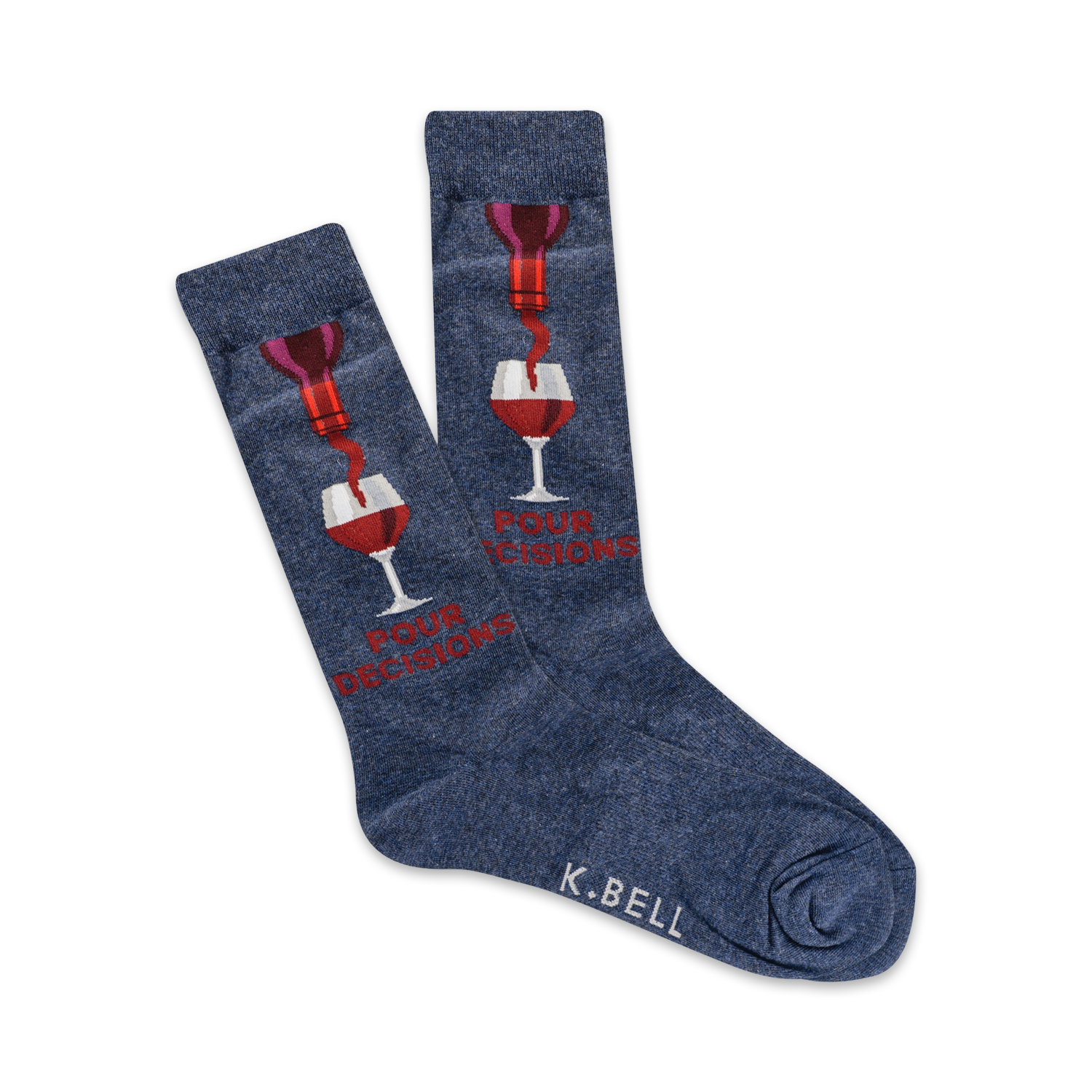 Pour Decisions wine socks: Prepare to spill your glass of humor with these Pour Decisions socks! Featuring a dark blue backdrop and a vibrant graphic showcasing a bottle of wine gracefully pouring into a wine glass, the phrase "Pour Decisions" playfully adorns the sides, inviting chuckles from fellow wine enthusiasts. Step into these crew-length socks meant just for men, and let the jolly wine-themed pattern remind you to laugh at life's "spirited" misadventures.