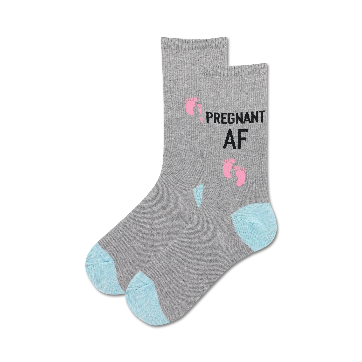Get a good chuckle in these maternity socks that'll have you laughing through those pregnancy pains. They're gray with blue toes and heels, with the words Pregnant AF in pink lettering, complete with tiny baby feet. Put your feet up in these comfy crew-length socks and show off your growing bump. They're a fun way to celebrate your pregnancy journey and make you smile every time you look down at your feet.
