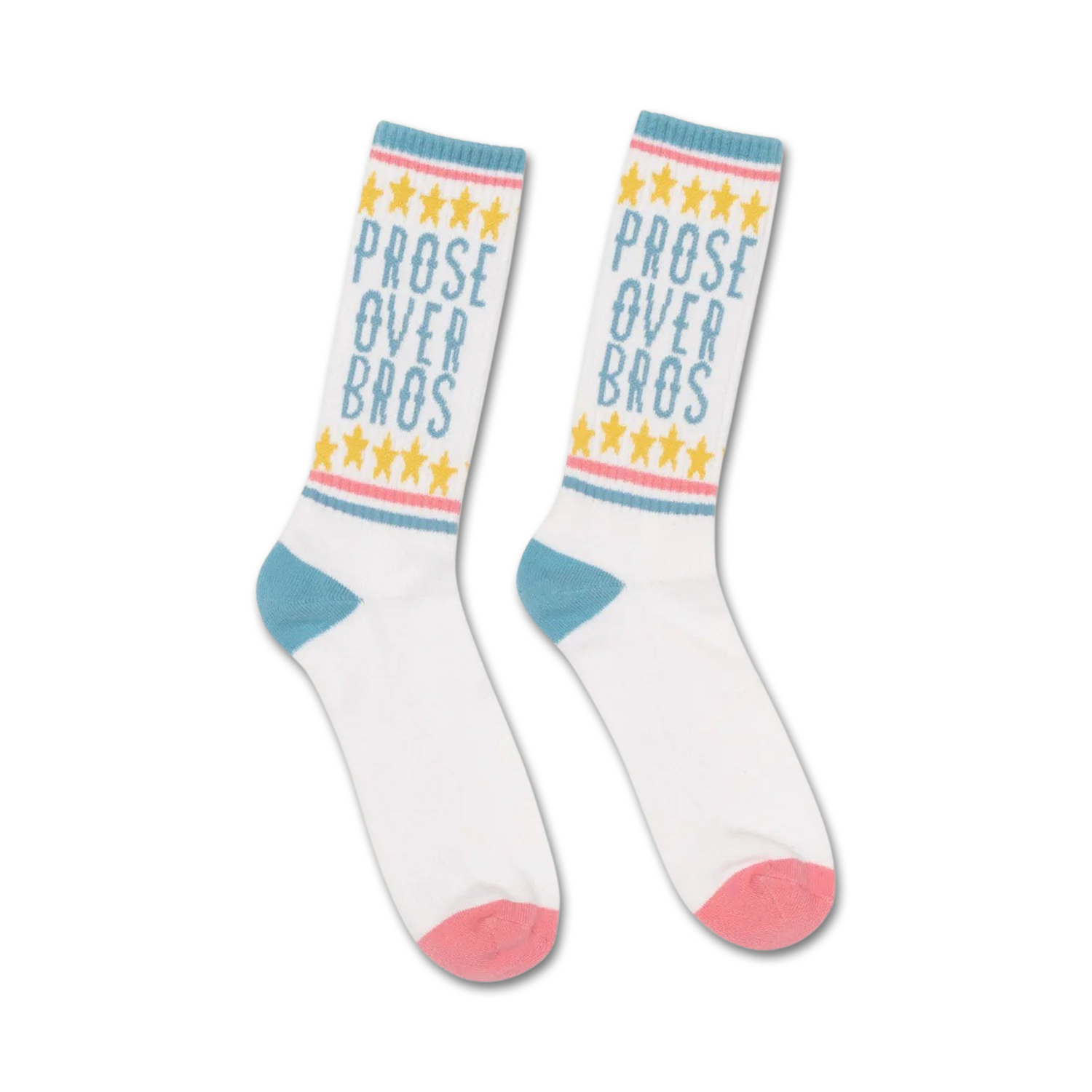 Ever get tired of your brother hogging all the warm, fuzzy blankets? Wear your love for literature on your soles with these "Prose Over Bros" art and literature-themed socks, featuring bright yellow stars, pink lettering, and a blue and white striped cuff. Perfect for bookworms, these unisex socks with a pink heel will add a bit of flair to any library date or coffee shop study session.