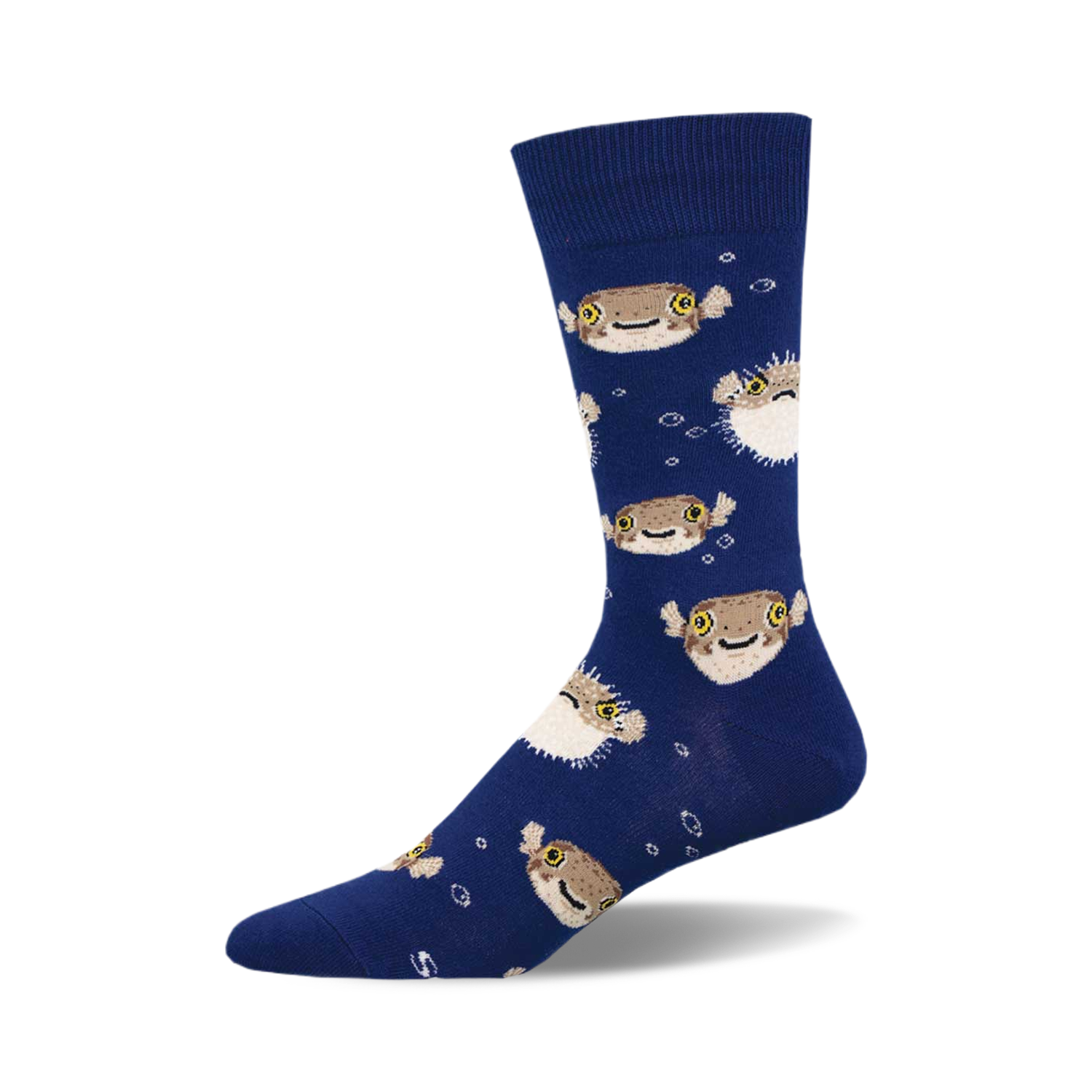 Dive into quirky vibes with our Pufferfish novelty socks! Sporting a playful parade of brown pufferfish with captivating yellow eyes against a serene blue backdrop, these crew-length socks add a pop of fun to any outfit. Perfect for casual outings, themed parties, or giving a cheeky spin to your office wear. Isn't it about time your feet show off their whimsical side too? Grab a pair, and let those charming puffer critters do the talking!