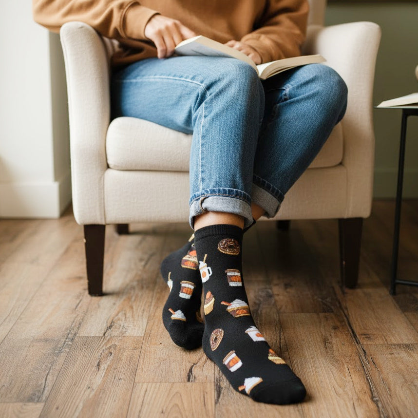 Pumpkin Spice socks, the perfect blend of everything Fall! With pumpkins, cupcakes, coffee cups, and donuts on a black background, these socks will make you feel like you're walking into your favorite coffee shop on a crisp autumn morning. Warning: May cause cravings for baked goods.