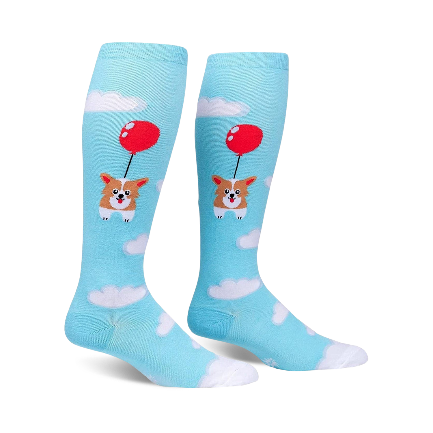 Let's pawty! These knee-high socks are made for walkin' with a corgi in the clouds! With a cute cartoon Corgi wearing a hat and leading the pack of red balloons on a light blue background, it's sure to be a paw-some day. Pup, Pup and Away!