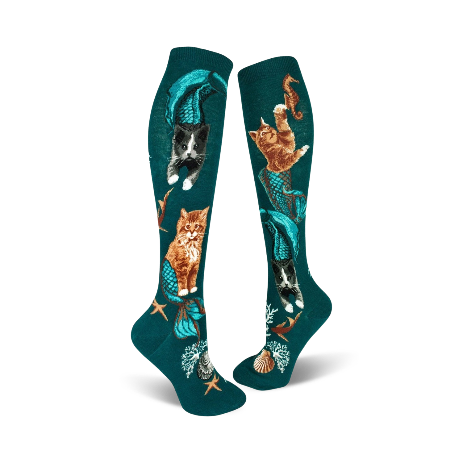 "Purrmaids" Knee High Socks for Women feature orange and black felines frolicking as mermaids amidst green and pink coral, orange starfish on a dark teal background. These cat-tastic leggings will make your feet feel like royalty! A fun way to add color, character, and whimsy to anyone's wardrobe, these feline-tastic mermaid leggings will have you wishing for a Purrmaids party wearing a pair of Purrmaids!