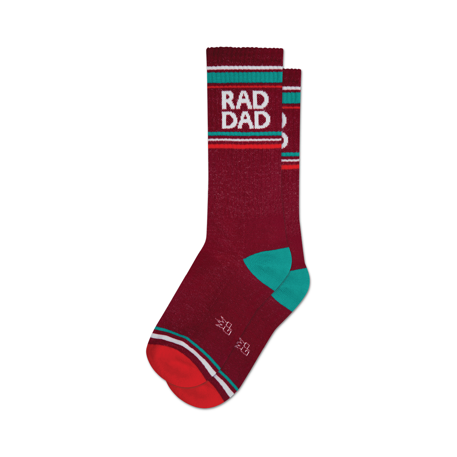 Celebrate the coolest dads around with our eye-catching Rad Dad socks. These snazzy socks feature bold RAD DAD lettering set against a vibrant red background, guaranteed to add a pop of color and a dash of whimsy to any outfit. Striped with white and teal at the top, they perfectly blend comfort and style. Great for Father's Day, dad's birthday, or just because, these socks are a fun way to show appreciation for the raddest dad out there. Tired of boring gifts? Give something that brings both warmth and a smile!