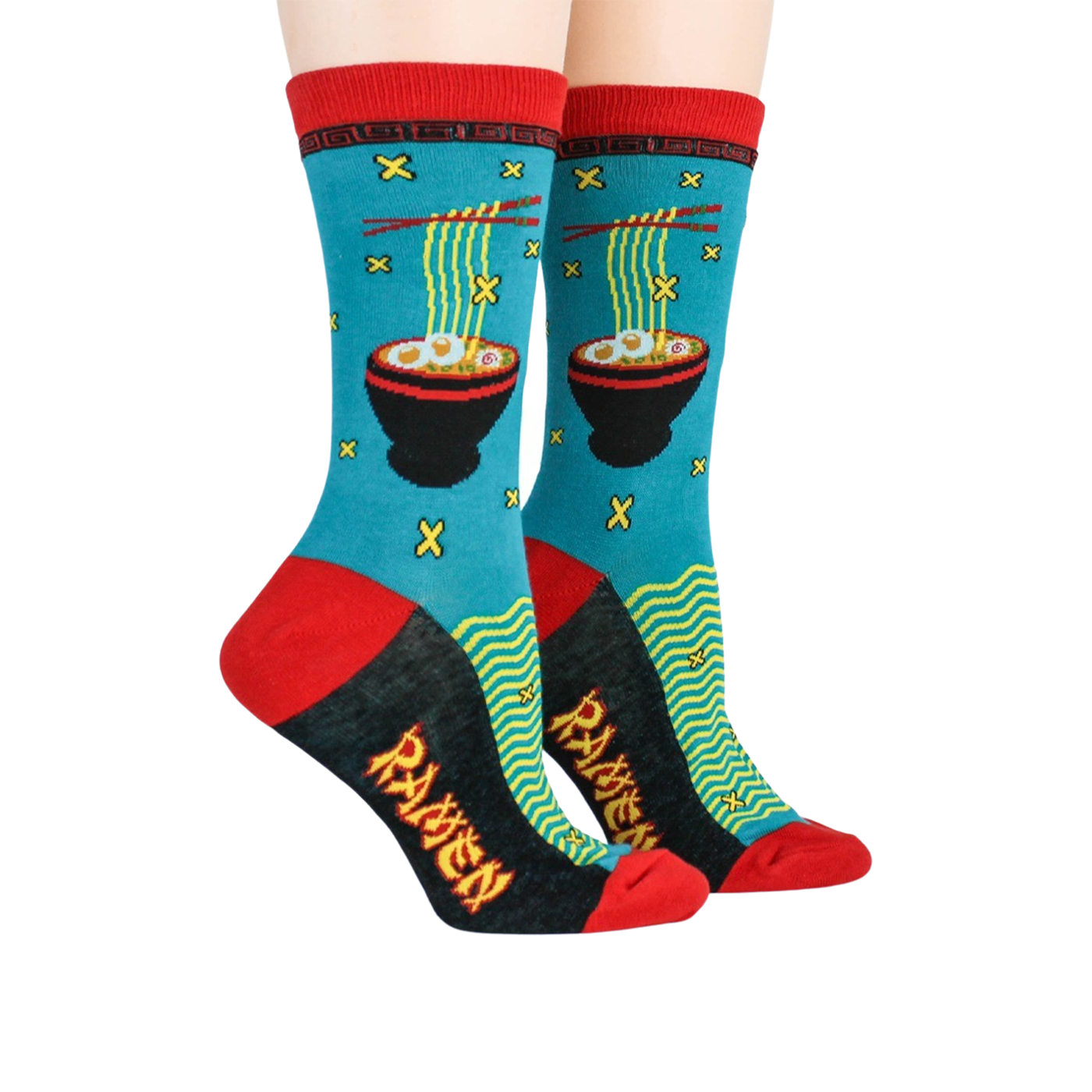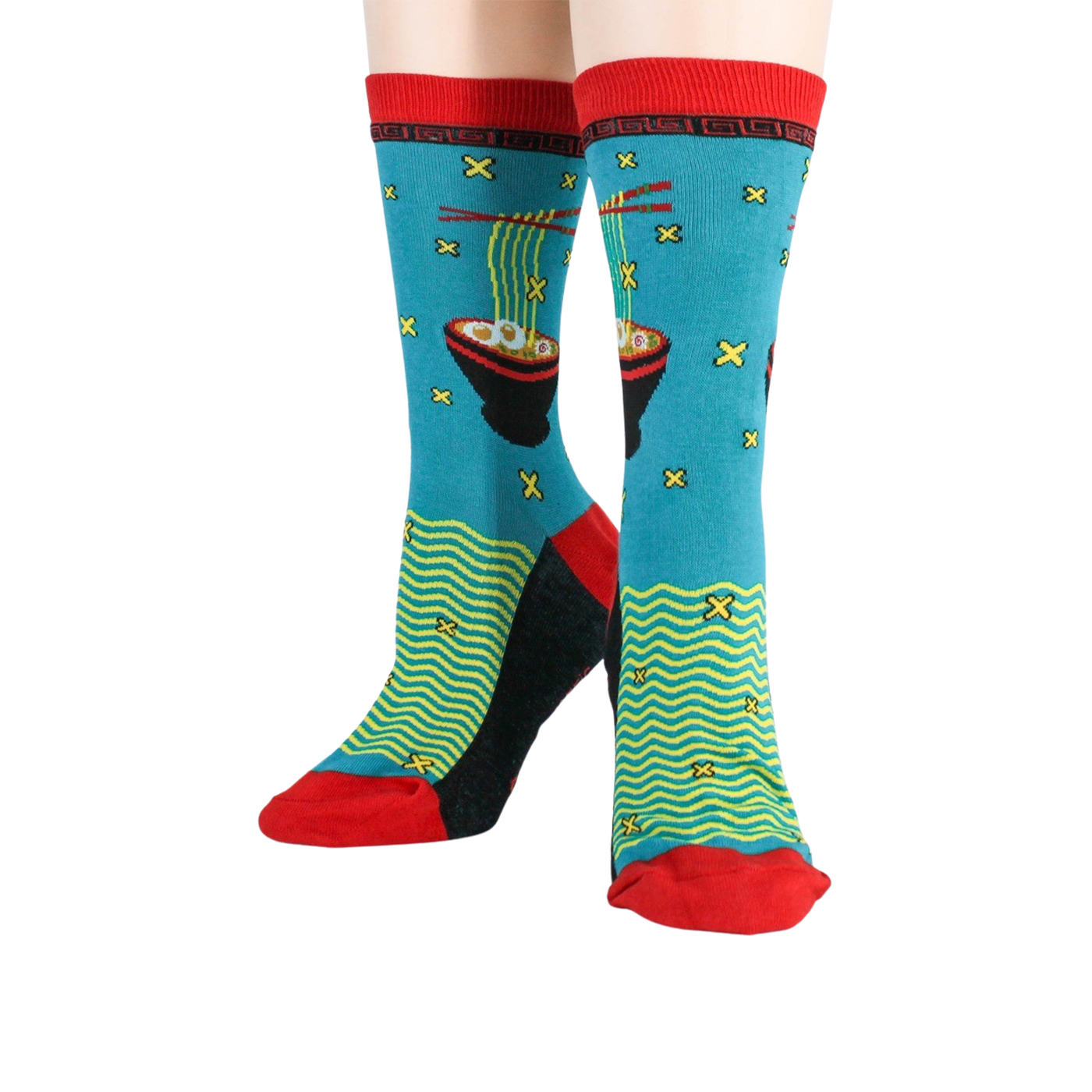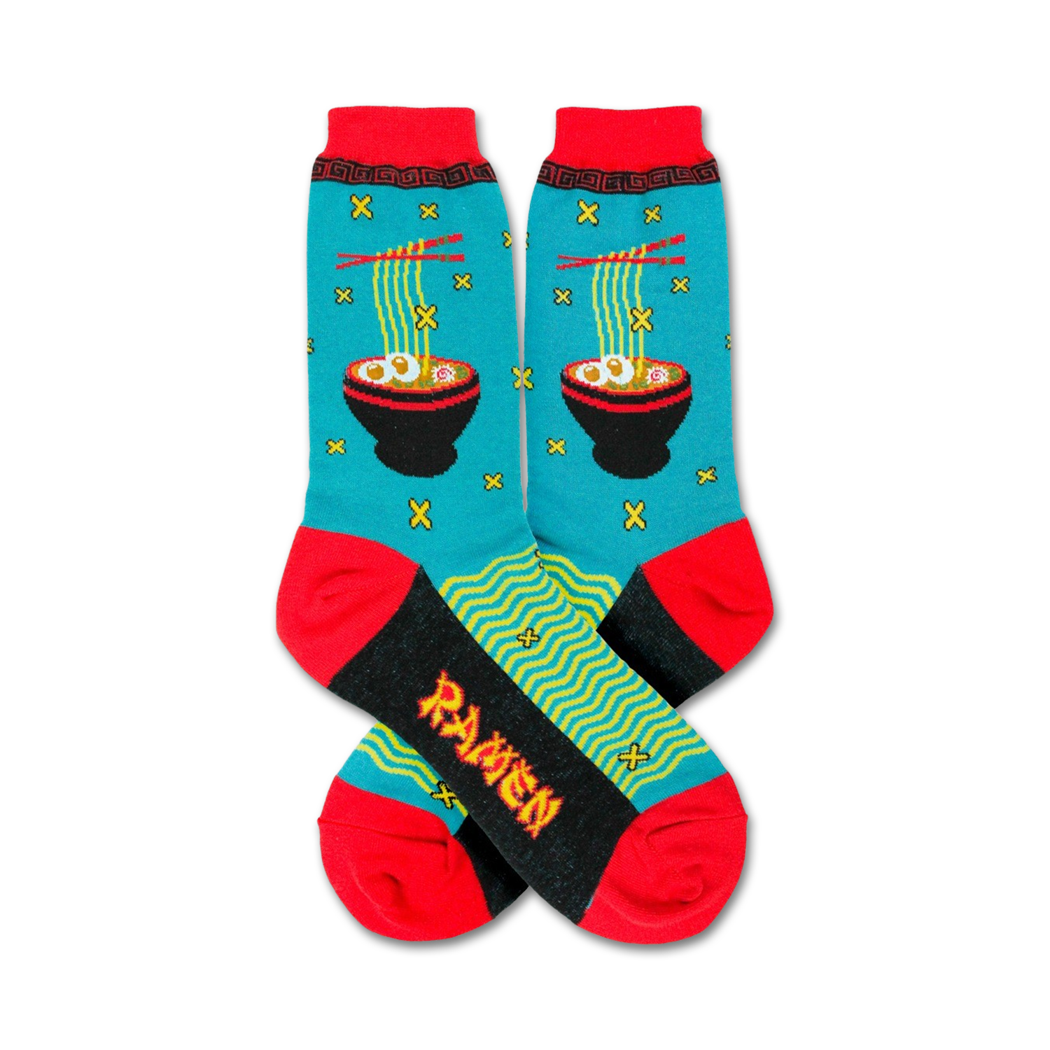 Get ready for a slurp-riffic adventure with our Ramen Crew socks! These socks are as appetizing as a hot bowl of ramen, featuring a vibrant blue background adorned with patterns of red chopsticks and black ramen bowls filled with yellow noodles and white eggs. The red toe, black sole, and heel add a dash of spice to this delicious design. Perfect for the foodie or ramen enthusiast in your life, these socks are sure to make you crave a bowl of this savory dish.