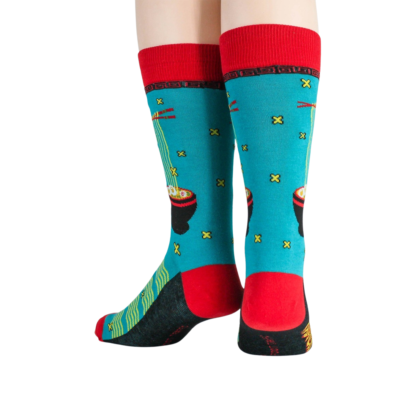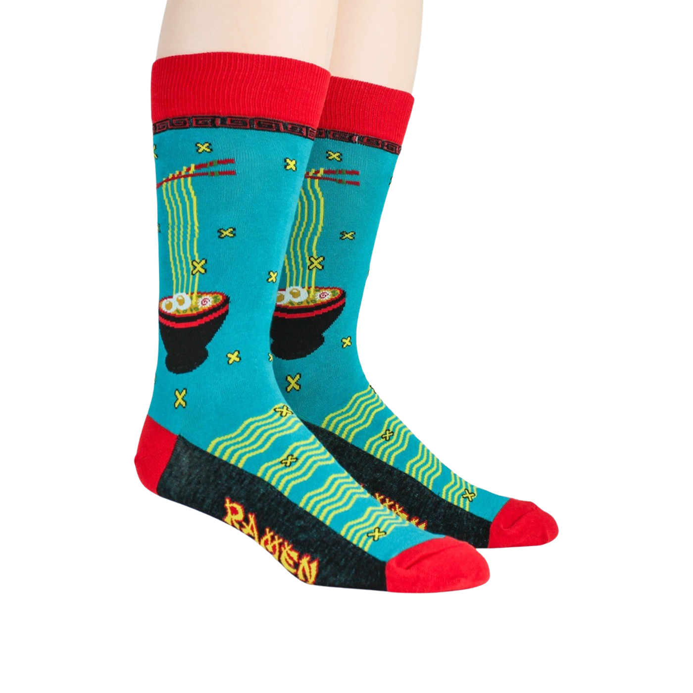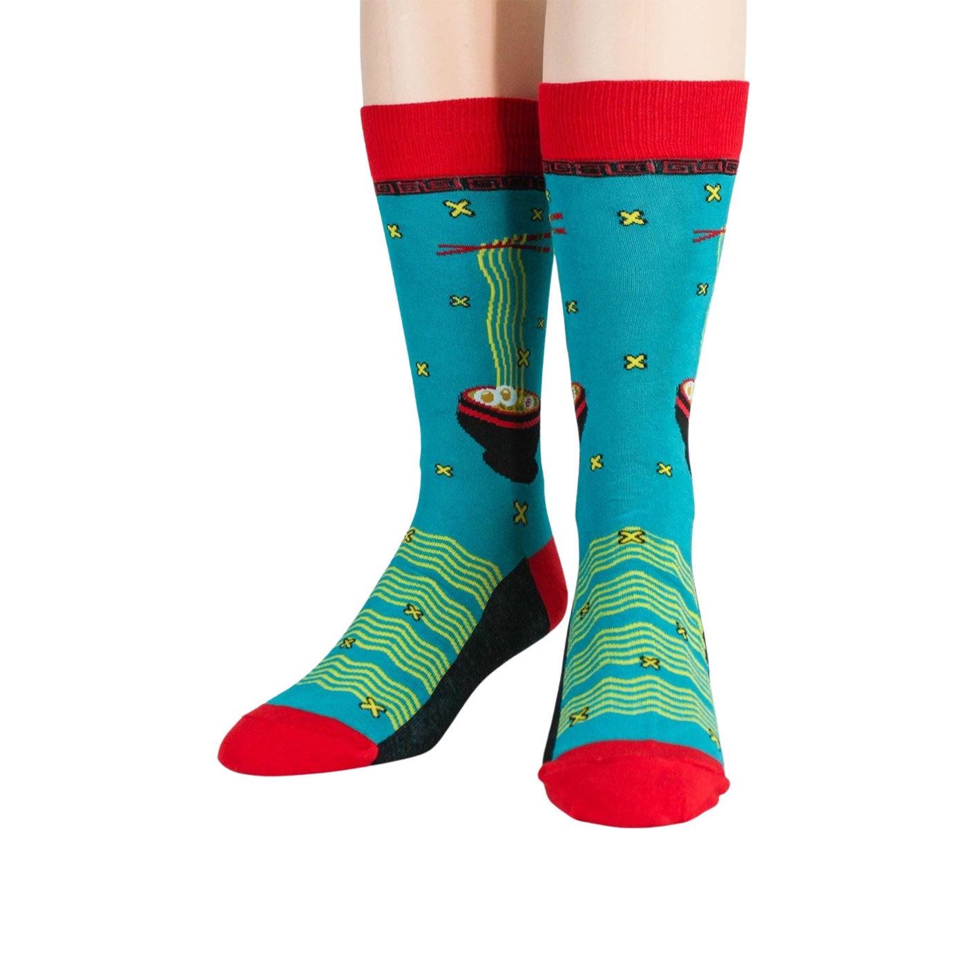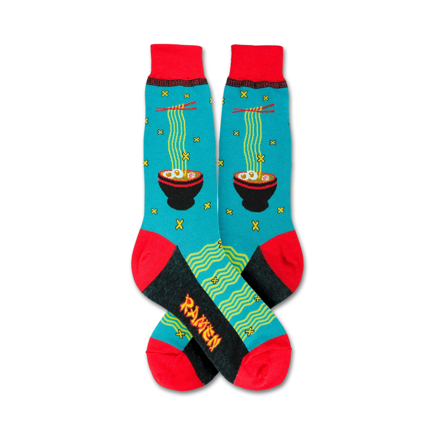 Blue ramen socks for men, featuring a pattern of black bowls filled with yellow noodles, green onions, and a red egg. The socks have a red toe and heel with yellow and green geometric shapes. Show your love for the best comfort food ever, or just show off some fun casual socks.
