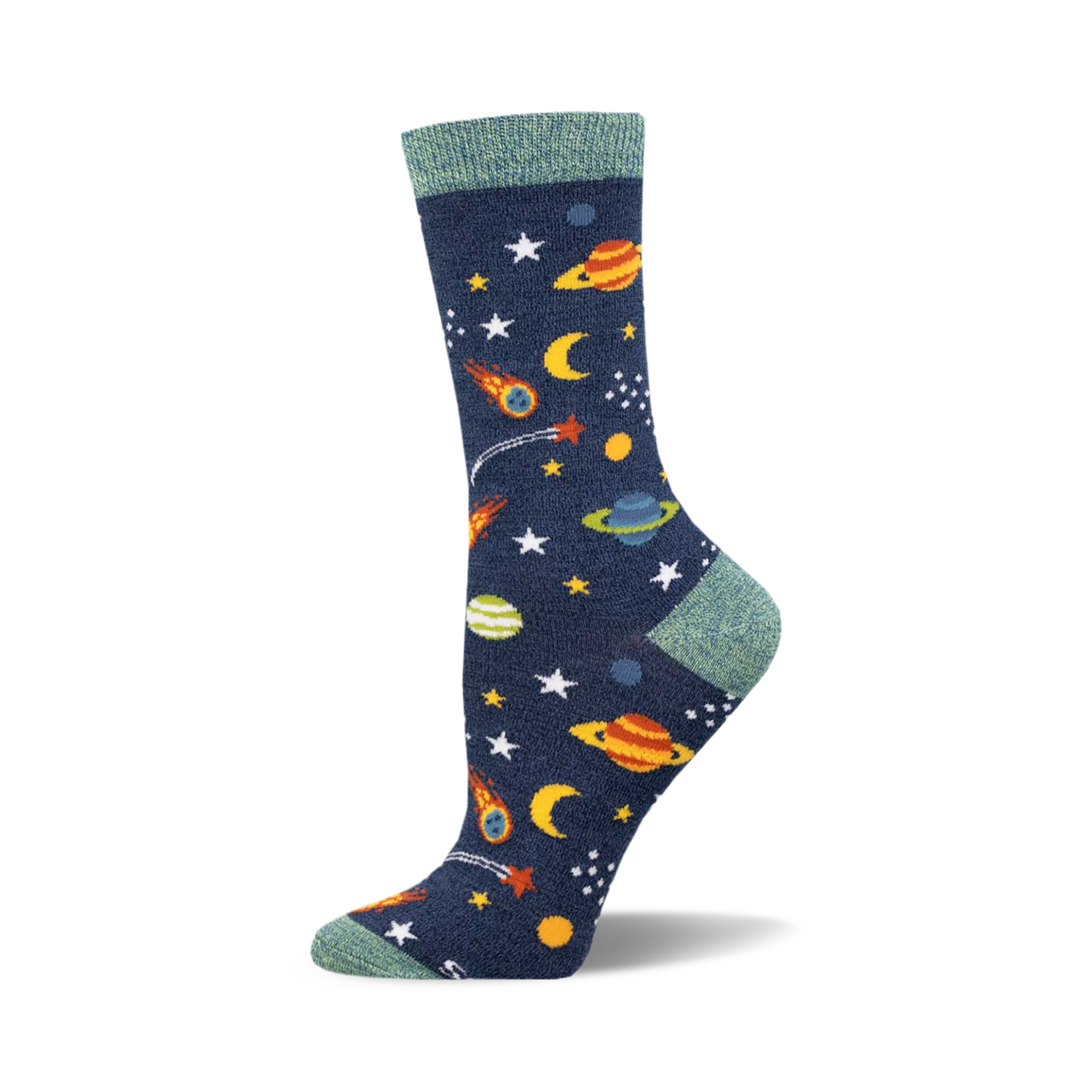 Elevate your sock drawer to cosmic proportions with our "Reach for the Stars Bamboo" socks! Adorned with a whimsical array of planets, moons, stars, comets, and shooting stars, these blue crew-length socks will add a stellar twist to any outfit. Perfect for stargazers and fashion-forward thinkers alike, they are a must-have for lounging at home or adding a pop of personality to your office attire. Why settle for ordinary when you can walk on the starry side of life?