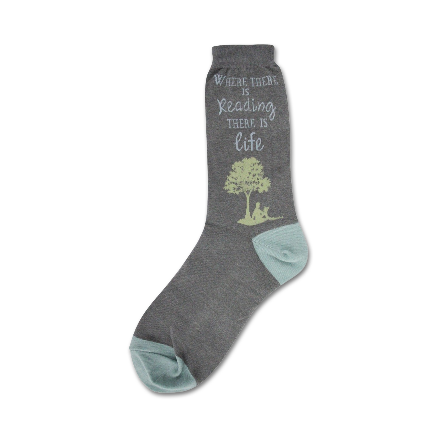 Put on a life-affirming phrase, and a pair of these blue and gray crew socks with an illustration of a person reading a book under a tree. Because sometimes, all it takes is a good book and a cozy spot to put life back in perspective.