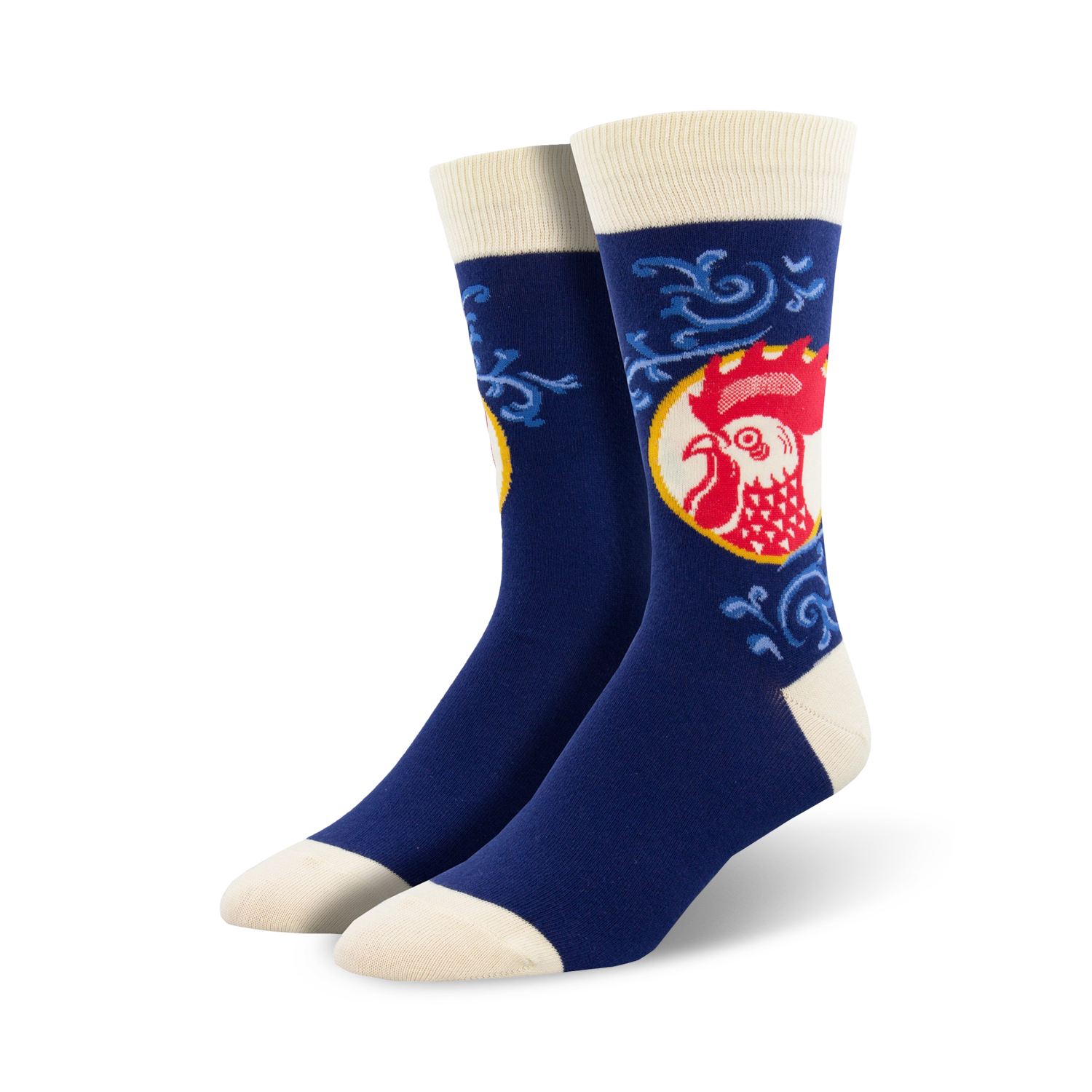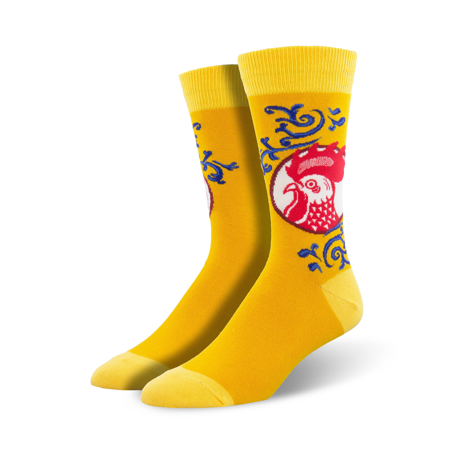 Bold and vibrant, Red Rooster socks are the perfect way to add some fun to your feet. Featuring a cartoon rooster on a yellow sock with red, blue, and white accents, these socks are sure to get a rise out of your friends and family. With a crew length and made for men, Rooster socks are made for strutting your stuff all day long. Whether you're a chicken chaser or just love roosters, these socks are a great pick.